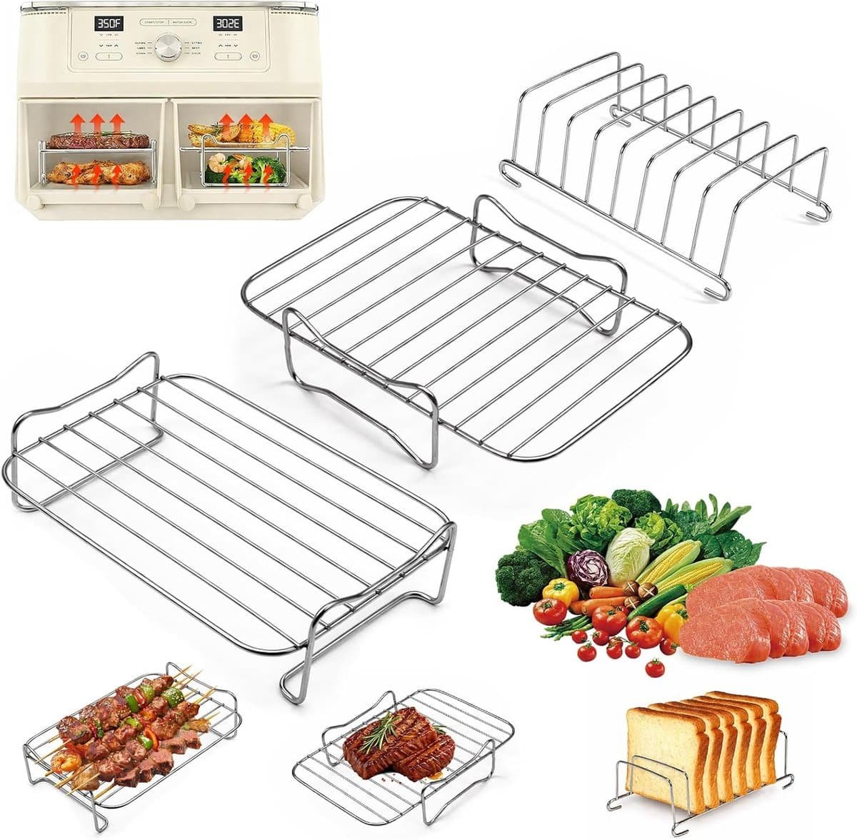 Ontdek de ultieme upgrade voor uw culinaire avonturen met deze set van drie hoogwaardige herbruikbare accessoires voor uw luchtfriteuse. Speciaal ontworpen om de functionaliteit van uw keukenapparaat te maximaliseren, biedt deze set een praktische oplossing voor iedereen die graag creatief kookt en bakt. Herkent u het probleem dat uw luchtfriteuse soms beperkt in zijn mogelijkheden is, waardoor u niet altijd het gewenste resultaat behaalt? Of mist u de juiste hulpmiddelen om een grotere variëteit aan gerechten te bereiden, zoals brood of extra lagen van uw favoriete snacks? Deze set is de oplossing die u zoekt, ontworpen om deze uitdagingen te overwinnen en uw kookervaring te verbeteren. Deze veelzijdige set bestaat uit twee roosters en een broodrooster, vervaardigd uit duurzaam roestvrij staal. De roosters zijn ideaal voor het bereiden van meerdere porties tegelijkertijd, waardoor u efficiënter kunt werken en tijd bespaart. Bak bijvoorbeeld twee lagen frietjes, groenten of vlees naast elkaar, of gebruik de extra ruimte voor het garen van bijgerechten. Het meegeleverde broodrooster is perfect voor het roosteren van broodjes, croissants of andere bakproducten, waardoor u uw ochtenden kunt beginnen met heerlijk vers geroosterde lekkernijen. Deze accessoires zijn niet alleen functioneel, maar ook ontworpen om de luchtcirculatie in uw luchtfriteuse te optimaliseren, wat resulteert in een gelijkmatigere garing en knapperigere resultaten. Gebruik ze thuis in uw keuken om gezondere maaltijden te bereiden met minder olie, of neem ze mee op vakantie als u ook onderweg wilt genieten van uw favoriete luchtfriteusegerechten. Ze zijn ook uitermate geschikt voor het bereiden van snacks tijdens feestjes of familiebijeenkomsten. Ervaar het gemak van het bereiden van meer voedsel in één keer, waardoor u meer tijd overhoudt voor uzelf en uw dierbaren. Geniet van de flexibiliteit om een breder scala aan recepten uit te proberen, van hartige hoofdgerechten tot zoete desserts. De stabiele constructie van de roosters zorgt ervoor dat uw voedsel veilig en stevig blijft liggen tijdens het garen, wat bijdraagt aan een zorgeloze kookervaring. Het materiaal is niet alleen robuust, maar ook eenvoudig te reinigen, zodat u minder tijd kwijt bent aan de afwas en meer tijd kunt besteden aan het genieten van uw zelfbereide maaltijden. De verbeterde luchtcirculatie zorgt voor een optimale bereiding van uw gerechten, wat resulteert in een superieure textuur en smaak. Een uniek verkoopargument van deze set is de universele compatibiliteit met de meeste luchtfriteusemodellen. Met afmetingen van 20,5 cm (lengte) × 14,3 cm (breedte) × 15,5 cm (hoogte) passen deze accessoires naadloos in diverse apparaten, wat ze tot een waardevolle toevoeging maakt aan elke keuken. De duurzame roestvrijstalen constructie garandeert een lange levensduur en behoudt zijn vorm en functionaliteit, zelfs bij frequent gebruik. Bovendien zijn de accessoires ontworpen met het oog op eenvoudige reiniging en opslag, wat het onderhoud minimaal maakt. Voeg deze praktische en veelzijdige set toe aan uw keukenuitrusting en transformeer uw luchtfriteuse in een nog krachtiger culinair gereedschap. Bestel vandaag nog en begin met het ontdekken van nieuwe smaken en bereidingsmogelijkheden!