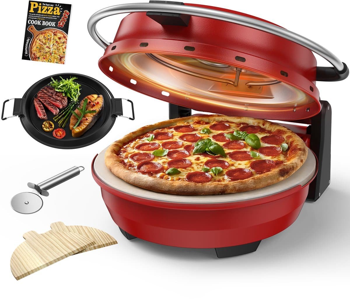 AIRMSEN 2-in-1 Elektrische Pizzaoven met Grillplaat thuis – 4 Min Pizza – 5 Temperatuurniveaus – 32cm Pizzasteen – Max 400°C – 1500W – Rood – Voor Thuis & Keuken
