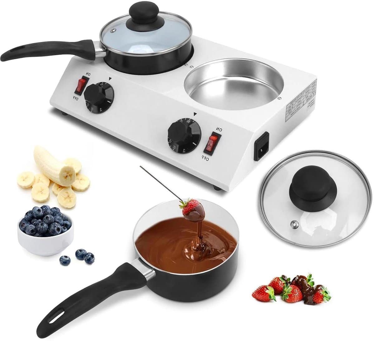 Allecta – Elektrische chocoladesmelter met 2 tanks en 80 W vermogen voor perfecte chocoladesmelt in de keuken. Ideale chocoladesmeltenmachine met temperatuurpan voor bakken – EU-stekker 220 V.