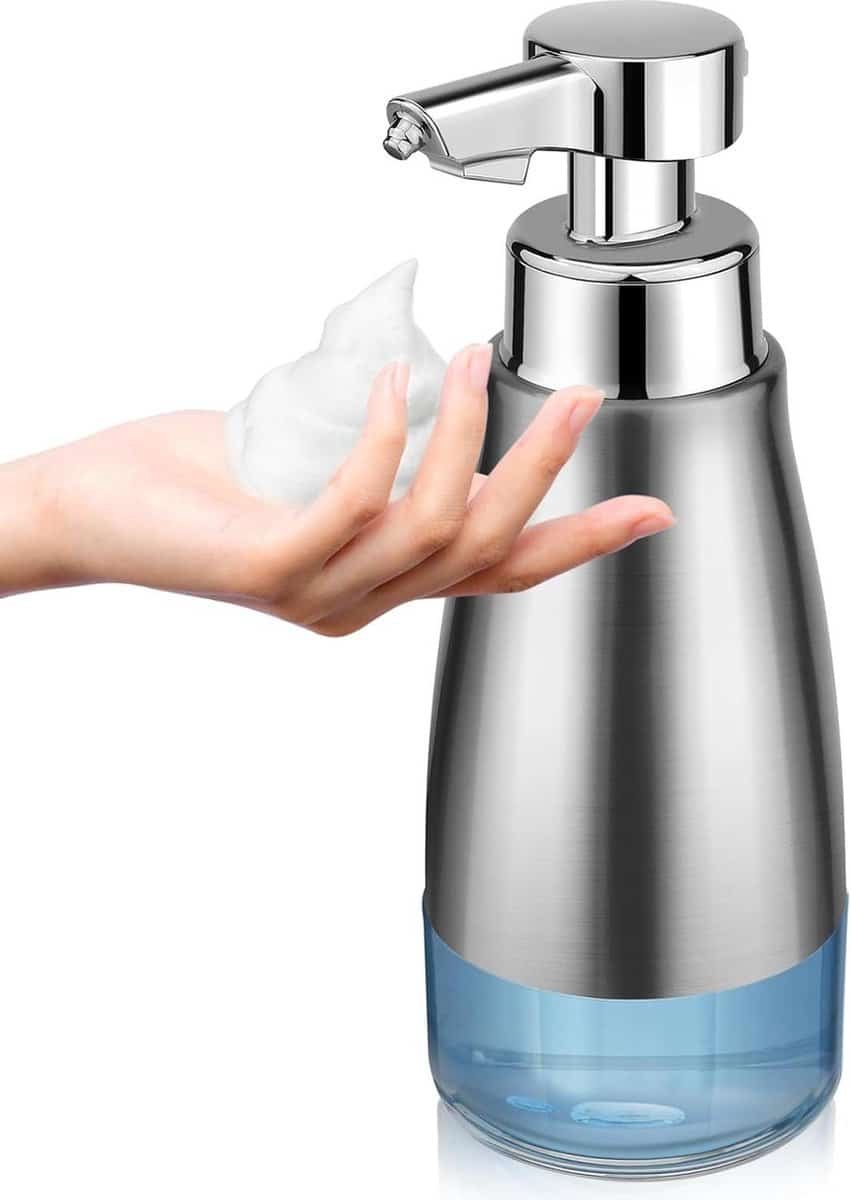 De behuizing van de zeepdispenser is gemaakt van roestvrij staal, waardoor de fles een klassieke en praktische uitstraling heeft. Het oppervlak is gemakkelijk te reinigen en te onderhouden, waardoor het perfect is voor dagelijks gebruik. De bediening met één knop zorgt voor gemak en eenvoud, en de dispenser geeft de juiste hoeveelheid vloeistof af voor een optimaal gebruik.