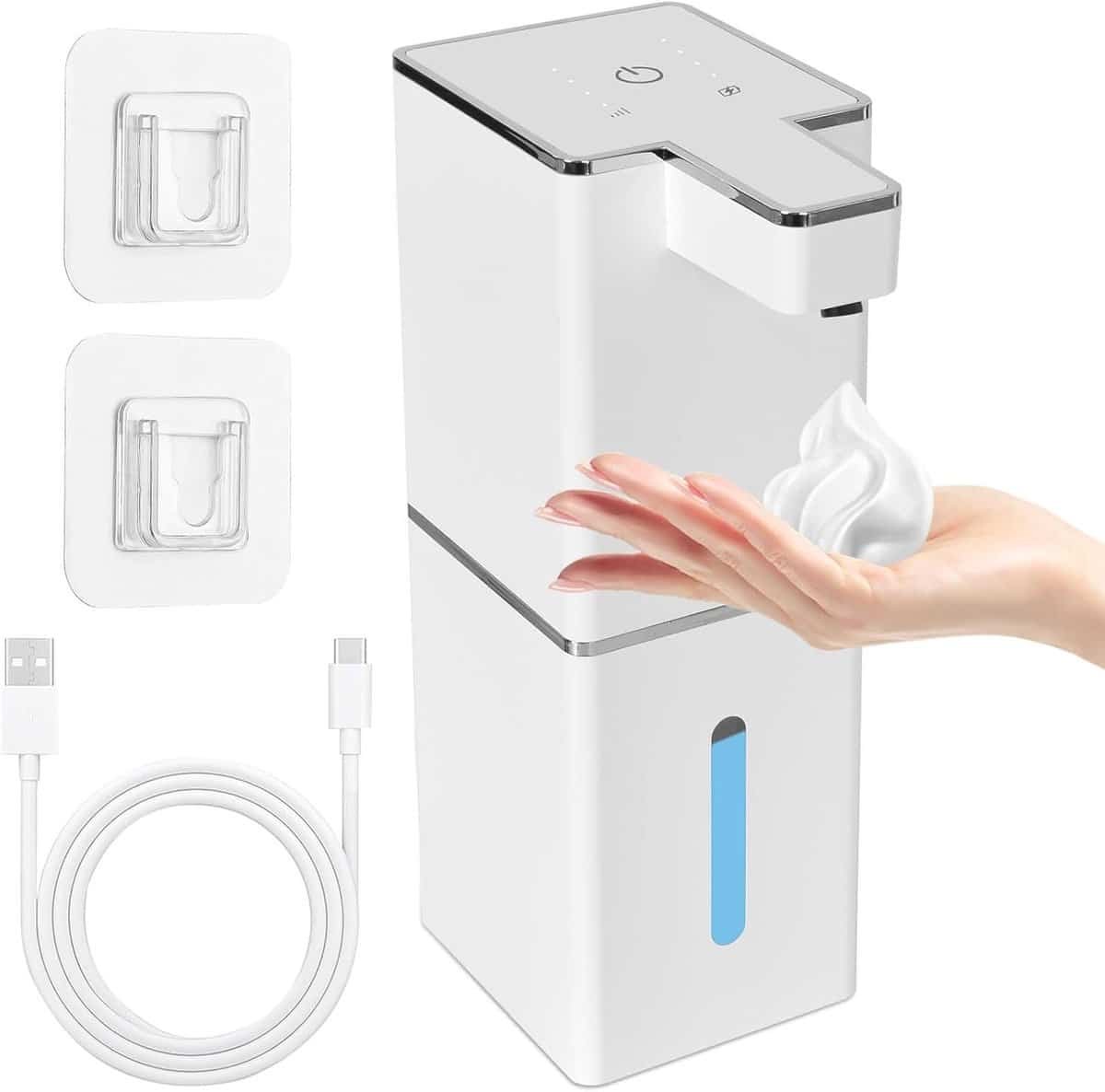 Automatische zeepdispenser – Aan de muur bevestigd, contactloos en zonder boren, 380 ml elektrische zeepdispenser met infraroodsensor, USB-oplaadbare schuimzeepdispenser voor badkamer, toilet, keuken (wit)