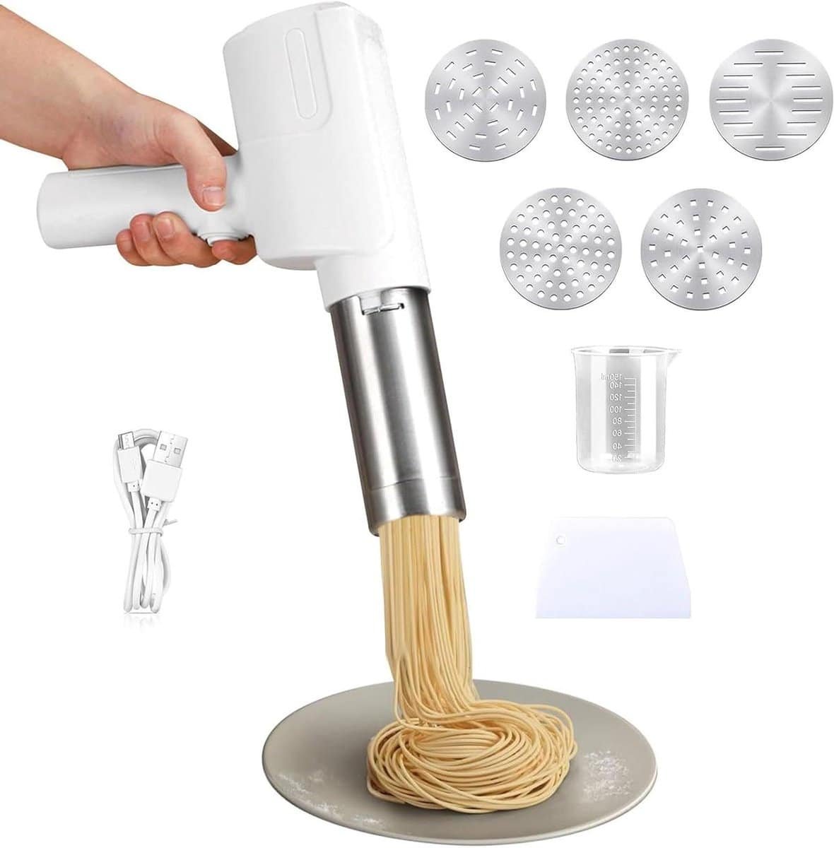 Dit pastamaker is ontworpen met een ergonomisch handvat, waardoor het draadloos en draagbaar is. Hierdoor is het eenvoudig te gebruiken in de keuken, tuin of buiten. Met 5 verwisselbare vormen en bijgeleverde accessoires kan je variëren tussen spaghetti, tagliatelle, brede en vierkante pasta. De meegeleverde maatbeker, spatel, kneedzak en worstopzetstuk maken het pasta maken nog gemakkelijker.