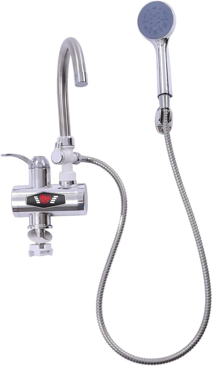 Ervaar direct warm water met deze innovatieve elektrische doorstroomkraan, de perfecte oplossing voor uw keuken of badkamer. Zeg vaarwel tegen het wachten op warm water en geniet van direct comfort, precies wanneer u het nodig heeft. Deze kraan is ontworpen om uw dagelijkse taken te vergemakkelijken en uw leven aangenamer te maken. Herkent u het ongemak van koude handen tijdens het afwassen of het wachten op warm water voor uw ochtendritueel? Met deze doorstroomkraan behoort dat tot het verleden. De kraan levert onmiddellijk warm water, waardoor u tijd bespaart en het comfort in uw woning aanzienlijk verhoogt. Ideaal voor drukke ochtenden, snelle schoonmaaktaken of wanneer u gewoonweg direct behoefte heeft aan warm water. Deze veelzijdige kraan is niet alleen geschikt voor thuisgebruik, maar ook voor hotels, campers, werkplaatsen en andere locaties waar direct warm water gewenst is. De 360° draaibare uitloop zorgt voor maximale flexibiliteit bij het reinigen van grote pannen of het bereiken van alle hoeken van de gootsteen. Of u nu groenten wilt wassen, de afwas doet, of snel uw handen wilt verwarmen, deze kraan past zich moeiteloos aan uw behoeften aan. De meegeleverde douchekop met flexibele slang biedt extra functionaliteit, perfect voor het spoelen van objecten die niet direct onder de kraan passen, of voor het comfortabel douchen van huisdieren. Geniet van het ultieme gemak en de efficiëntie die deze doorstroomkraan biedt. De snelle verwarmingstechnologie zorgt ervoor dat u binnen enkele seconden warm water heeft, wat resulteert in een aanzienlijke besparing op uw waterverbruik. Het intuïtieve LCD-scherm toont de exacte watertemperatuur, zodat u altijd de controle heeft en verbranding door te heet water wordt voorkomen. Dit zorgt voor extra veiligheid, met name in huishoudens met kinderen. De duurzame constructie, met een roestvrijstalen verwarmingselement en een robuuste ABS-behuizing, garandeert een lange levensduur en betrouwbare prestaties. Een uniek kenmerk van deze kraan is de geavanceerde LCD-temperatuurweergave, waarmee u de watertemperatuur nauwkeurig kunt monitoren. Dit voegt een laag van veiligheid en gebruiksgemak toe die u niet bij standaard kranen vindt. Bovendien is de kraan ontworpen met het oog op veiligheid, met IPX4 waterdichtheid en gescheiden water- en elektriciteitscircuits, inclusief bescherming tegen oververhitting en kortsluiting. De kraan kan op twee manieren worden geïnstalleerd: op het werkblad of onder het werkblad, wat flexibiliteit biedt bij de montage. De mogelijkheid om te kiezen tussen een gebogen kraanuitloop en een douchekop met slang maakt deze kraan uitzonderlijk veelzijdig voor diverse reinigingstaken. Wacht niet langer en upgrade uw keuken of badkamer met deze efficiënte en gebruiksvriendelijke elektrische doorstroomkraan. Ervaar het comfort van direct warm water en maak uw dagelijkse taken eenvoudiger en aangenamer. Bestel vandaag nog en geniet van een verbeterde woonervaring!