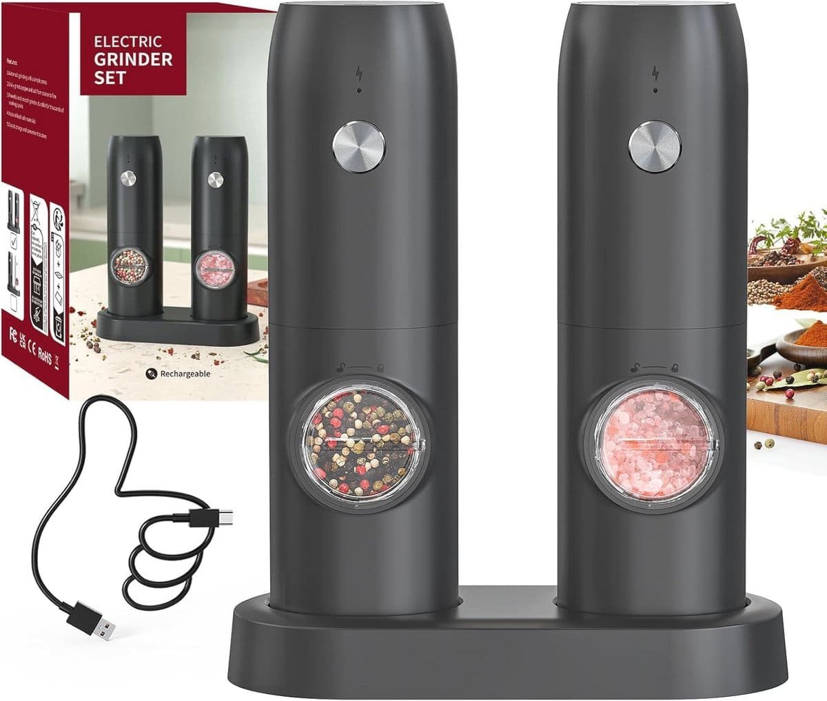 Elektrische Pepermolen Set – USB Oplaadbaar met Instelbare Grofheid en Keramische Molen voor Thuis en Keuken