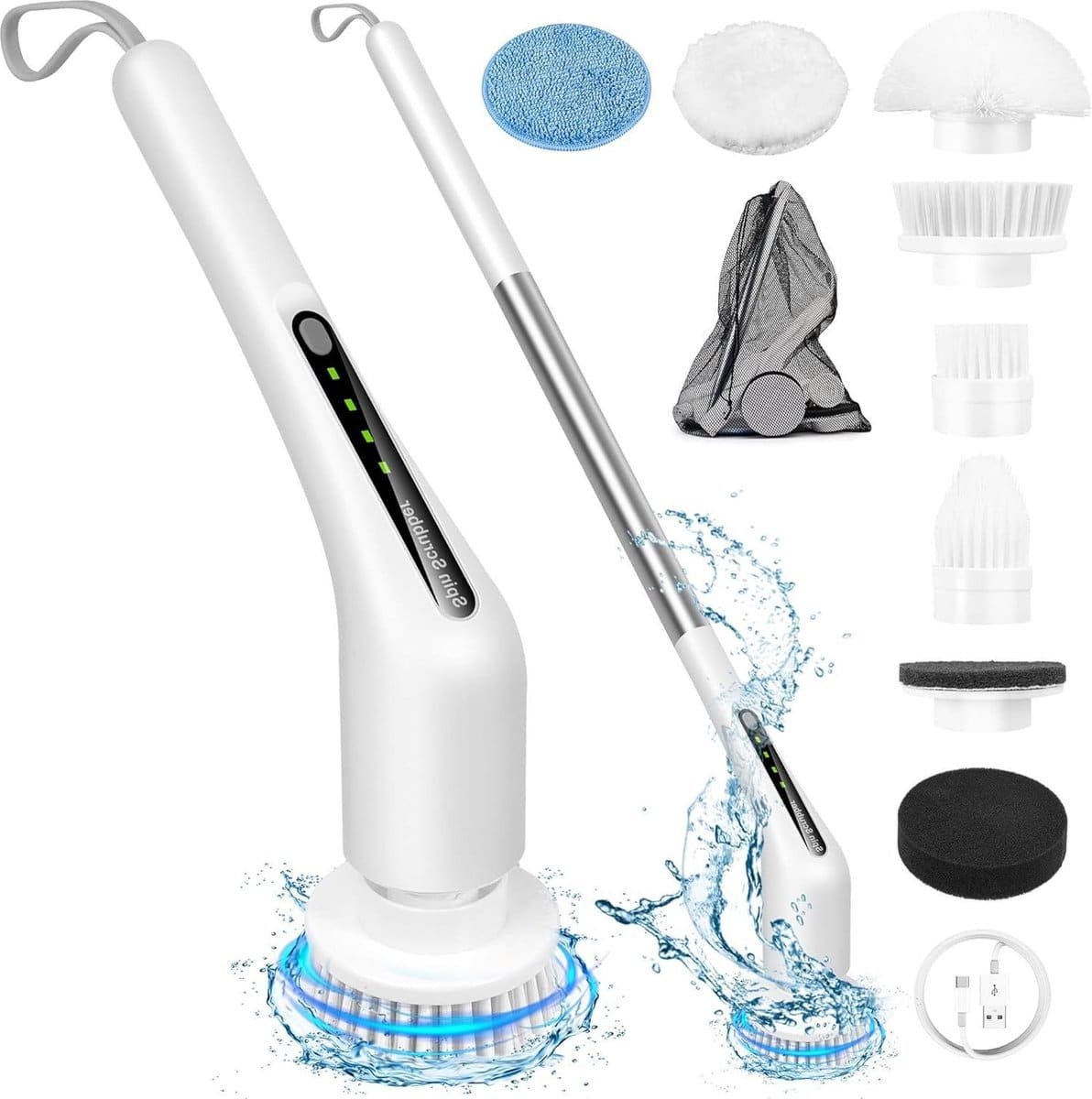 De elektrische reinigingsborstel wordt geleverd met een uittrekbare en afneembare roestvrijstalen handgreep, waardoor je elke hoek kunt reinigen zonder te hoeven bukken of strekken. Met twee toerentalinstellingen en een lange batterijduur van twee 2500 mAh batterijen, biedt deze borstel ultiem comfort en veelzijdigheid bij het schoonmaken.