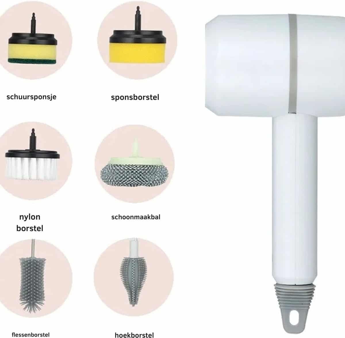 Elektrische Schoonmaakborstel – Hand Schrobber – Schoonmaak borstel elektrisch – Oplaadbaar – Schrobborstel – Schrobmachine – Poetsmachine met 6 opzetstukken – Voor badkamer of keuken – Wit