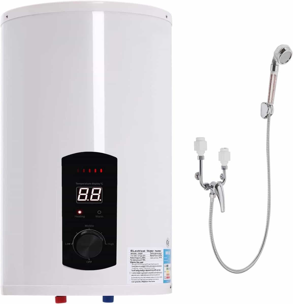 Ontdek deze moderne, verticale elektrische warmwaterboiler van 30 liter, ideaal voor de keuken of wasruimte. Deze compacte boiler (34 x 59 cm) met een vermogen van 2000W warmt water snel op en is eenvoudig te monteren. **Belangrijkste Kenmerken:** * **Inhoud:** 30 Liter (6,6 Gallon) * **Vermogen:** 2000 Watt voor snelle verwarming. * **Temperatuurbereik:** Instelbaar van 25°C tot 75°C. * **Druk:** Nominale druk van 0,7 MPa. * **Montage:** Verticaal, geschikt voor wandmontage. * **Materiaal:** Duurzaam roestvrij staal en email met een porseleinbrandproces. * **Veiligheid:** IPX4 waterdichtheidsklasse. * **Aansluiting:** EU-standaard stekker, G1/2 interface. **Wat zit er in de doos?** U ontvangt de 30L elektrische boiler, een waterkraan, een handdouche, 3 slangen en alle benodigde montageaccessoires. Handleidingen in het Engels, Duits en Frans zijn inbegrepen. **Belangrijke Opmerkingen:** Dit product is niet geschikt voor buitendouches. Lees voor installatie en gebruik altijd de meegeleverde veiligheidsinstructies zorgvuldig door. Regelmatige reiniging van de binnenvoering wordt aanbevolen om roestvorming te voorkomen. Schakel het apparaat uit en droog de interne componenten indien deze vochtig zijn voordat u de behuizing sluit. Gebruik het apparaat niet wanneer de waterleiding bevroren is.