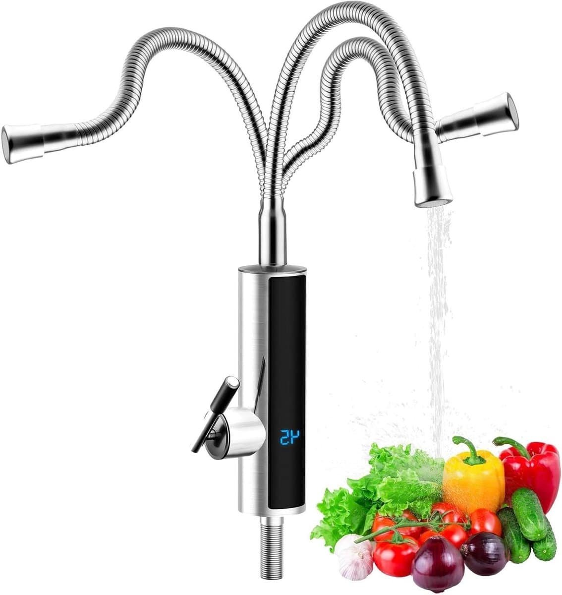 Elektrische waterkraan 3000W met led-temperatuurweergave, 360 graden draaibaar – RVS kraan voor keuken, badkamer, caravan, camping