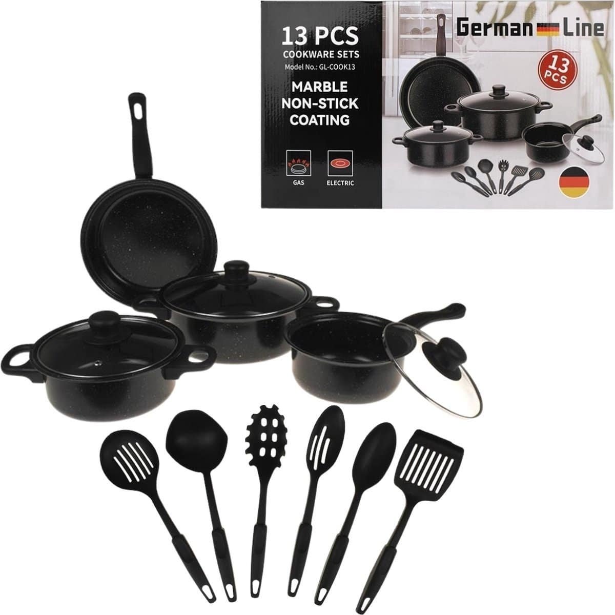 German Line – 13 delige Pannenset – Inclusief Kookgerei – 13 delig – Complete Pannenset – Koekenpannen – Soeppannen – Steelpannen – Antiaanbaklaag – voor Gas en Elektrische Kookplaten – voor elke Keuken – Softgrip Handvatten – Lichtgewicht – Zwart