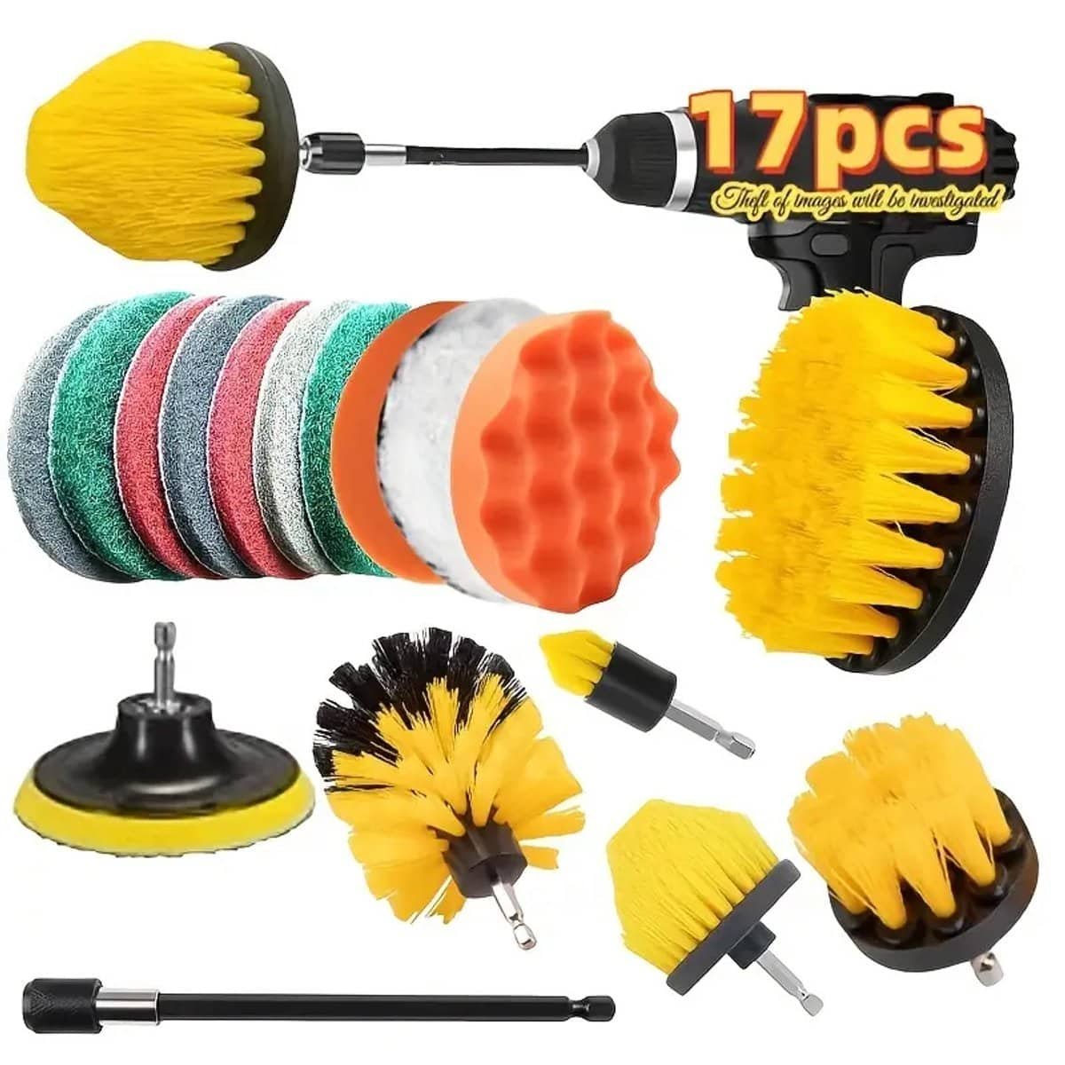 PolkaHome 17-delige Boorborstel Set – Elektrische Schrobborstels & Polijstpads met Verlengstuk – Voor Auto, Badkamer, Keuken, Tegels, Douche, Vloeren, Velgen & Meer – Herbruikbare Opzetstukken