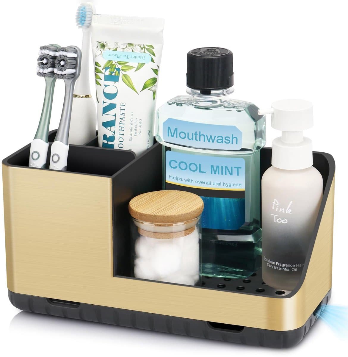 Tandenborstelhouder voor badkamerorganizer, elektrische tandenborstelhouder met afvoergat, uitneembare tandenborstelorganizer voor badkamer, keuken en gezin (geborsteld goud)
