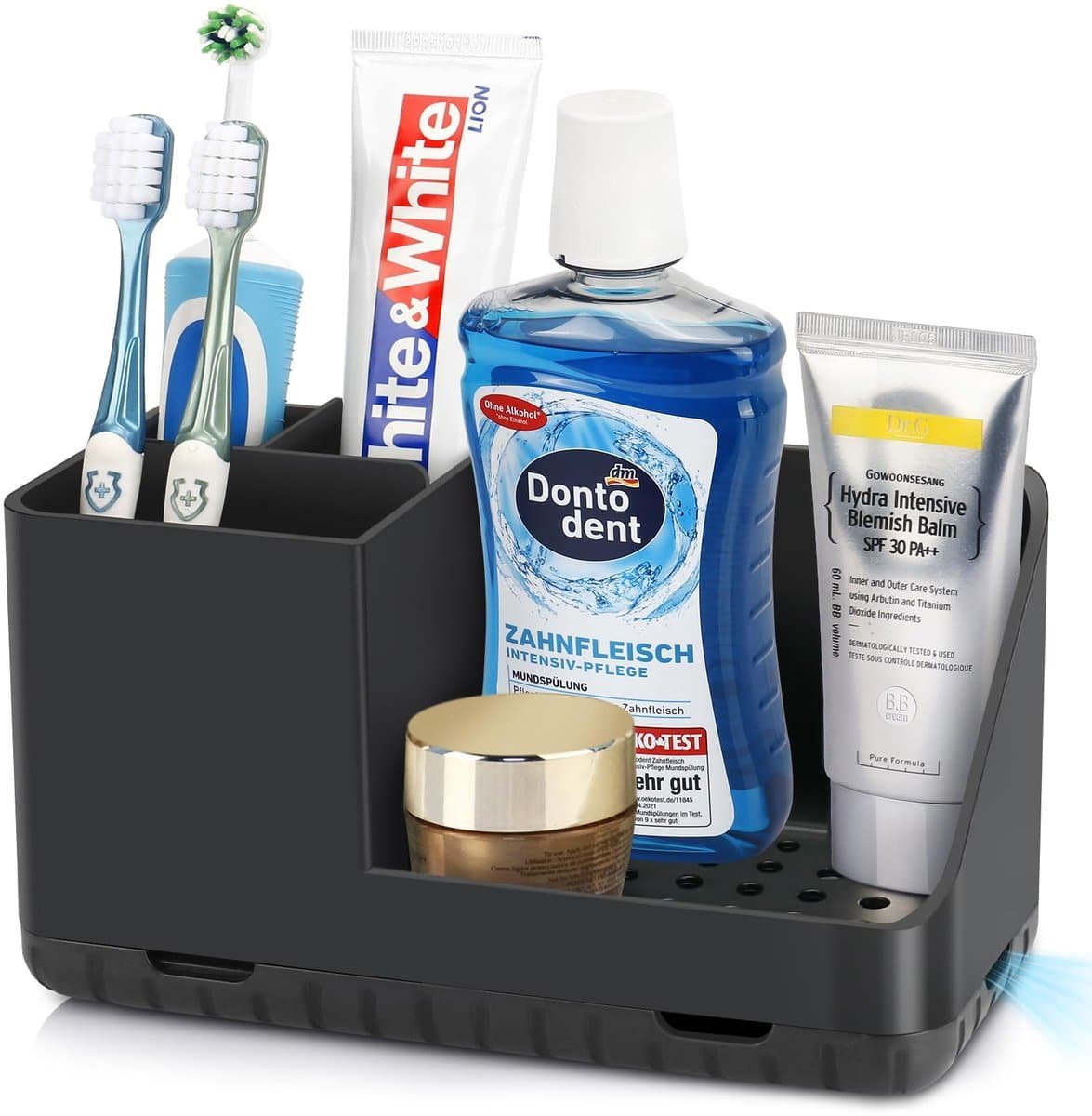 HOOGWAARDIG MATERIAAL: De tandenborstelhouder is gemaakt van hoogwaardig HIPS-kunststof. Er zijn geen bramen, dus je hoeft je geen zorgen te maken over het bezeren van je handen. De extra dikke wand maakt hem zeer praktisch en stevig. Je hoeft je geen zorgen te maken over breuk of roest. OPBERGRUIMTE IN DE BADKAMER: Het gecompartimenteerde ontwerp van de badkamerorganizer is groot genoeg om diverse badkamerartikelen op te bergen. Je kunt er badkameraccessoires zoals tandenborstels, tandpasta, cosmetica, mondwater, scheermesjes en flosdraad in kwijt, wat aanzienlijk ruimte bespaart op je aanrecht. VERWIJDERBAAR & GEMAKKELIJK SCHOON TE MAKEN: De onderkant van de tandenborstelhouder is verwijderbaar, wat schoonmaken gemakkelijker maakt. Je kunt hem verwijderen en eenvoudig afspoelen met water of afnemen met een vochtige doek. Antislip afvoer: De onderkant van de elektrische tandenborstelhouder is voorzien van vier rubberen pads en meerdere afvoergaten. De antislipstrip voorkomt dat de tandenborstelhouder valt en krassen op de tafel veroorzaakt. Meerdere afvoergaten aan de onderkant zorgen ervoor dat water altijd kan weglopen, waardoor er zich geen vocht ophoopt op de bodem van de tandenborstel en tandpasta. Bovendien zorgen ze voor goede ventilatie, zodat uw badkamer droog en netjes blijft.