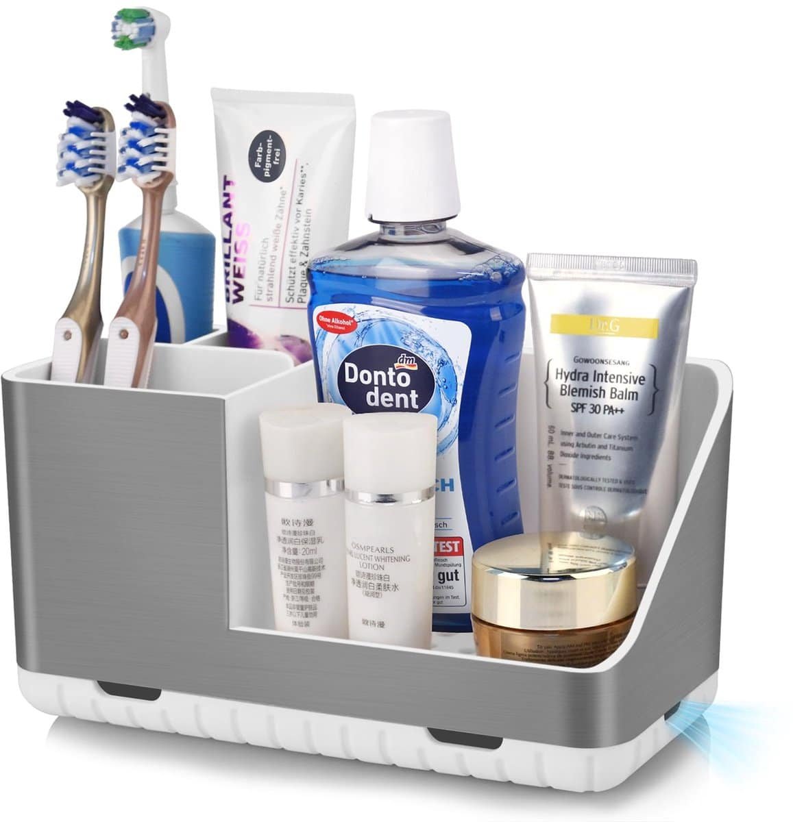 HOOGWAARDIG MATERIAAL: De tandenborstelhouder is gemaakt van hoogwaardig HIPS-kunststof. Er zijn geen bramen, dus je hoeft je geen zorgen te maken over het bezeren van je handen. De extra dikke wand maakt hem zeer praktisch en stevig. Je hoeft je geen zorgen te maken over breuk of roest.OPBERGRUIMTE IN DE BADKAMER: Het gecompartimenteerde ontwerp van de badkamerorganizer is groot genoeg om diverse badkamerartikelen op te bergen. Je kunt er badkameraccessoires zoals tandenborstels, tandpasta, cosmetica, mondwater, scheermesjes en flosdraad in kwijt, wat aanzienlijk ruimte bespaart op je aanrecht.VERWIJDERBAAR & GEMAKKELIJK SCHOON TE MAKEN: De onderkant van de tandenborstelhouder is verwijderbaar, wat schoonmaken gemakkelijker maakt. Je kunt hem verwijderen en eenvoudig afspoelen met water of afnemen met een vochtige doek.Antislip afvoersysteem: De onderkant van de elektrische tandenborstelhouder is voorzien van vier rubberen pads en meerdere afvoergaten. De antislipstrip voorkomt dat de tandenborstelhouder valt en krassen op de tafel veroorzaakt. Meerdere afvoergaten aan de onderkant zorgen ervoor dat water altijd kan weglopen, waardoor er zich geen vocht ophoopt op de bodem van de tandenborstel en tandpasta. Bovendien zorgen ze voor goede ventilatie, zodat uw badkamer droog en netjes blijft.