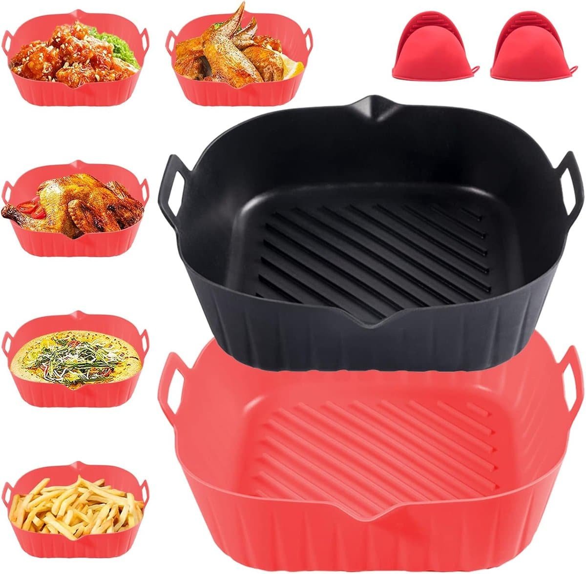 Eenvoudig te gebruiken: onze dubbelzijdige siliconen heteluchtfriteuse manden zijn aan beide zijden voorzien van handgrepen en voorzien van twee ovenhandschoenen om je handen te beschermen tegen verbranding bij het verwijderen van de siliconen pan.