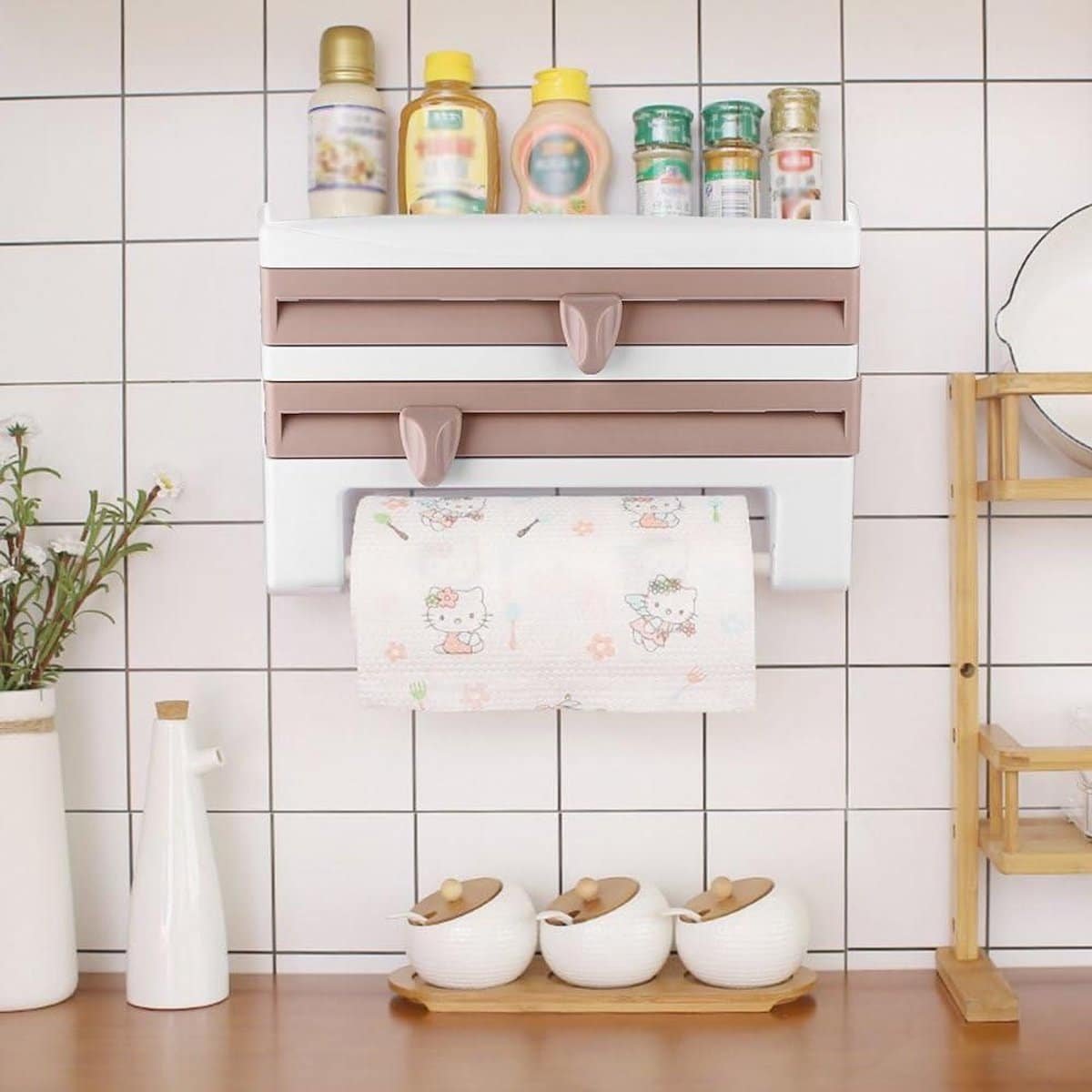 3-in-1 Keukenrolhouder met Foliesnijder en Kruidenhouder – Muurbeugel – 28cm Papieren Handdoeken – Keuken Accessoire – Khaki – 39x10x24cm.