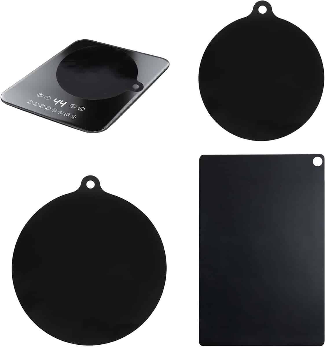 Inhoud van de verpakking: De set bestaat uit 3 stuks afdekkingen voor inductiekookplaten, waaronder 1 rechthoekig stuk (25 x 35 cm) en 2 ronde stukken (diameter 22 cm of 24 cm), die flexibel kunnen passen bij pannen van verschillende groottes.
