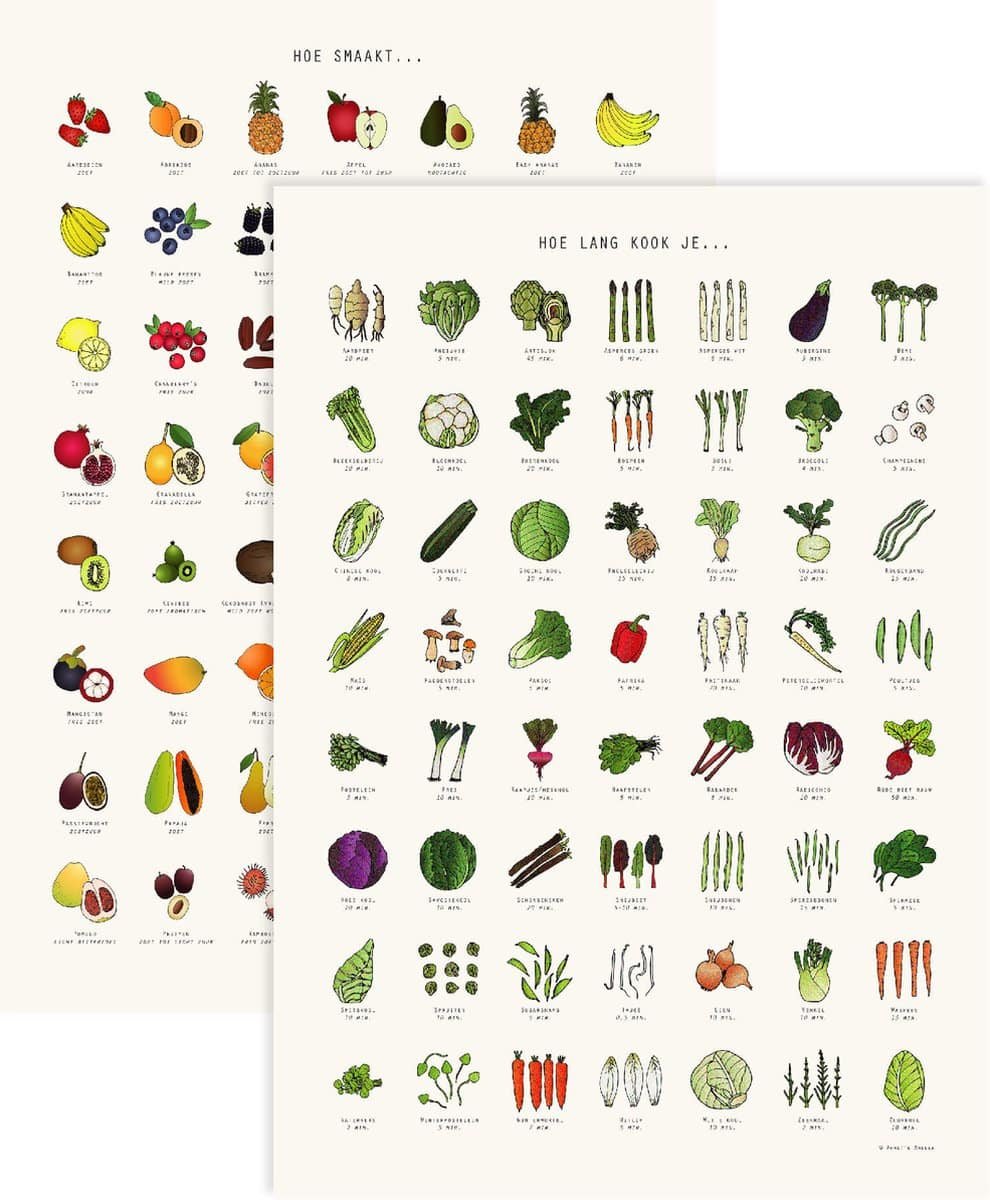 Deze poster set bestaat uit de ‘Hoe lang kook je…’ Groenteposter en de ‘Hoe smaakt…’ Fruitposter. De voedingposters zijn een eyecatcher in je keuken, super praktisch en handig. Hoe lang kook jij boontjes? Of bloemkool? Wat is de smaak van een kaki? Of een tamarillo?