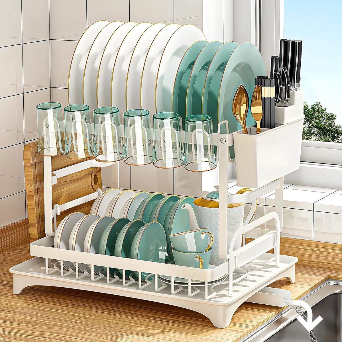 Afdruiprek 2 niveaus koolstofstaal automatische afwatering – bekerhouder snijplankhouder – FRASHENG afdruipplank – keuken accessoires dish drying rack