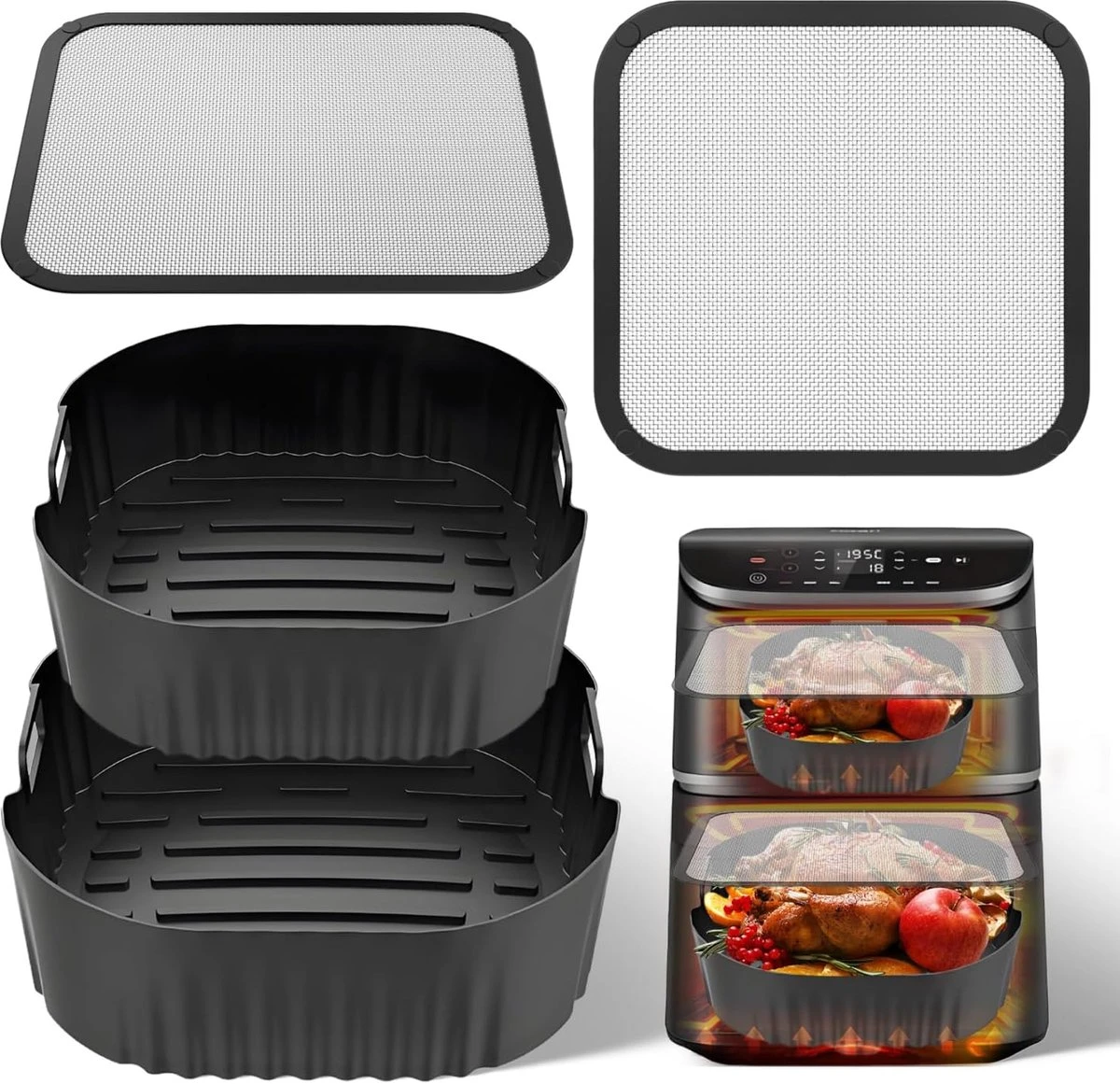 Transformeer uw culinaire ervaringen met deze essentiële 4-delige airfryer-accessoireset, speciaal ontworpen om uw kookgemak en resultaten naar een hoger niveau te tillen. Deze set is de perfecte aanvulling voor iedereen die het maximale uit zijn heteluchtfriteuse wil halen, en biedt een reeks praktische hulpmiddelen die het kookproces vereenvoudigen en verbeteren. Herkent u het probleem van ongelijkmatige bereiding of het schoonmaken van lastige plekken in uw airfryer? Heeft u moeite om de volledige capaciteit van uw apparaat te benutten zonder dat gerechten aan elkaar plakken of dat de warmte niet optimaal circuleert? Deze accessoires bieden de oplossing voor deze veelvoorkomende keukenfrustraties, waardoor u zich kunt concentreren op het genieten van heerlijke, perfect bereide maaltijden. Deze veelzijdige set is speciaal ontworpen om naadloos te passen in uw 10,8 liter heteluchtfriteuse, waardoor de binnenruimte optimaal wordt benut. De set bevat twee siliconen bakvormen van verschillende groottes (6,5 liter en 4,3 liter), ideaal voor het bereiden van diverse gerechten zonder dat deze aan elkaar plakken of de bodem van de airfryer vies wordt. Gebruik ze voor het bakken van cakes, het roosteren van groenten, het bereiden van snacks of zelfs voor het garen van vlees. De vorm is zo ontworpen dat deze de luchtcirculatie niet hindert, wat zorgt voor een gelijkmatige bereiding. Daarnaast bevat de set twee innovatieve magnetische spatbeschermers van roestvrij staal. Deze bevestigt u eenvoudig aan de bovenkant van uw airfryer, waar ze effectief voorkomen dat vetspatten ontsnappen en uw keuken schoonhouden. Dit maakt het schoonmaken na het koken een stuk eenvoudiger en aangenamer. De accessoires zijn perfect voor dagelijks gebruik thuis, of u nu een snelle lunch bereidt, een uitgebreid diner kookt of experimenteert met nieuwe recepten. Ze zijn ook ideaal voor het bereiden van gezonde snacks voor het hele gezin of voor het maken van feestelijke hapjes voor gasten. Ervaar het gemak van koken zonder zorgen. Deze set biedt niet alleen een schonere keuken, maar ook een efficiëntere bereiding van uw favoriete gerechten. Het gebruik van de siliconen bakvormen zorgt ervoor dat uw maaltijden minder snel aanbakken, wat resulteert in een betere textuur en smaak. De magnetische spatbeschermers bieden gemoedsrust door te voorkomen dat vet en etensresten zich verspreiden, waardoor u minder tijd kwijt bent aan schoonmaken en meer tijd overhoudt voor uzelf en uw dierbaren. Geniet van de flexibiliteit om verschillende soorten gerechten te bereiden, van knapperige frietjes tot sappige kip, allemaal met consistente en bevredigende resultaten. De duurzame materialen zorgen ervoor dat deze accessoires lang meegaan, waardoor ze een waardevolle investering zijn voor elke keukenliefhebber. Een uniek kenmerk van deze set zijn de magnetische spatbeschermers. Deze zijn ontworpen om stevig aan de bovenkant van de airfryer te hechten, waardoor ze effectief voorkomen dat vet en voedselresten opstijgen en zich verspreiden. Dit slimme ontwerp zorgt voor een schonere werkomgeving en minimaliseert de noodzaak voor intensieve schoonmaakbeurten na elke kooksessie. De siliconen bakvormen zijn vervaardigd uit hoogwaardig, voedselveilig siliconenmateriaal dat bestand is tegen hoge temperaturen en gemakkelijk schoon te maken is. De anti-aanbaklaag van de vormen zorgt ervoor dat voedsel niet blijft plakken, wat het verwijderen van bereide gerechten vergemakkelijkt en het schoonmaken nog eenvoudiger maakt. Verrijk uw kookervaring en maak van elke maaltijd een succes met deze praktische en innovatieve airfryer-accessoireset. Bestel vandaag nog en ontdek hoe eenvoudig en schoon koken kan zijn!