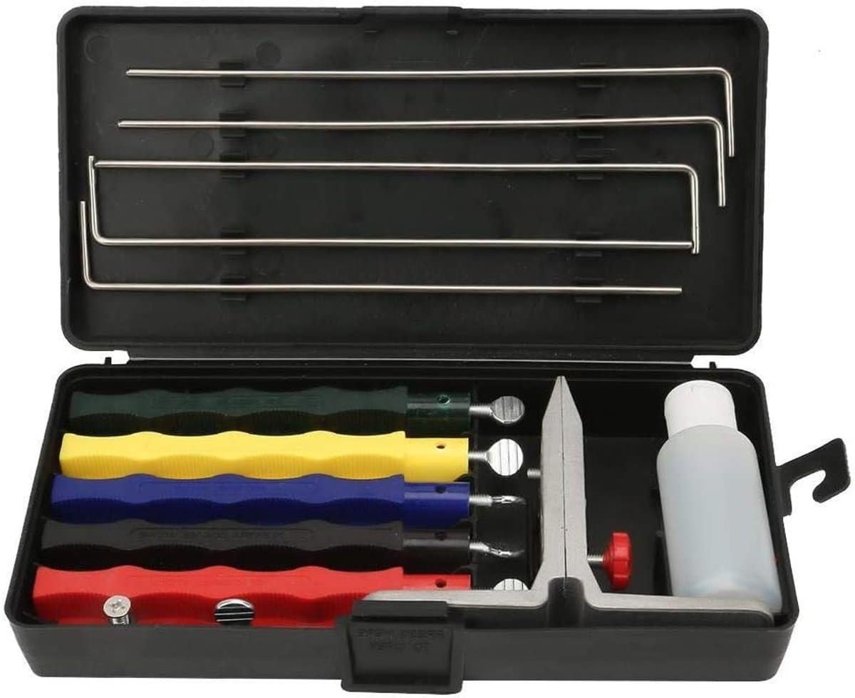 De set bevat alles wat je nodig hebt voor het slijpen van verschillende soorten messen, waardoor je altijd voorbereid bent op elke snijklus.