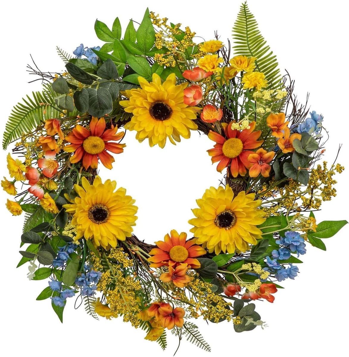 Deze kunstmatige zonnebloembloemenkrans met wilde bloemen toont levendige en realistische zonnebloemen en vangt de essentie van deze vrolijke bloemen. De heldergele kleur geeft elke kamer een warme en uitnodigende uitstraling.