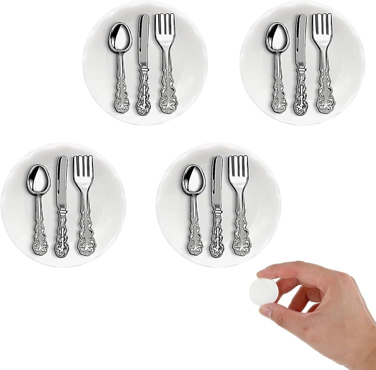 Miniatuur dinerset: Dit pakket bevat 4 prachtig vervaardigde mini-borden en 8 miniatuur serviesstukken, wat een perfecte combinatie biedt voor het decoreren van je miniatuurpoppenhuis. Of je nu een theekransje organiseert of een weelderige mini-dinerscène opzet, deze set heeft alle benodigdheden om aan je decoratieve behoeften te voldoen.