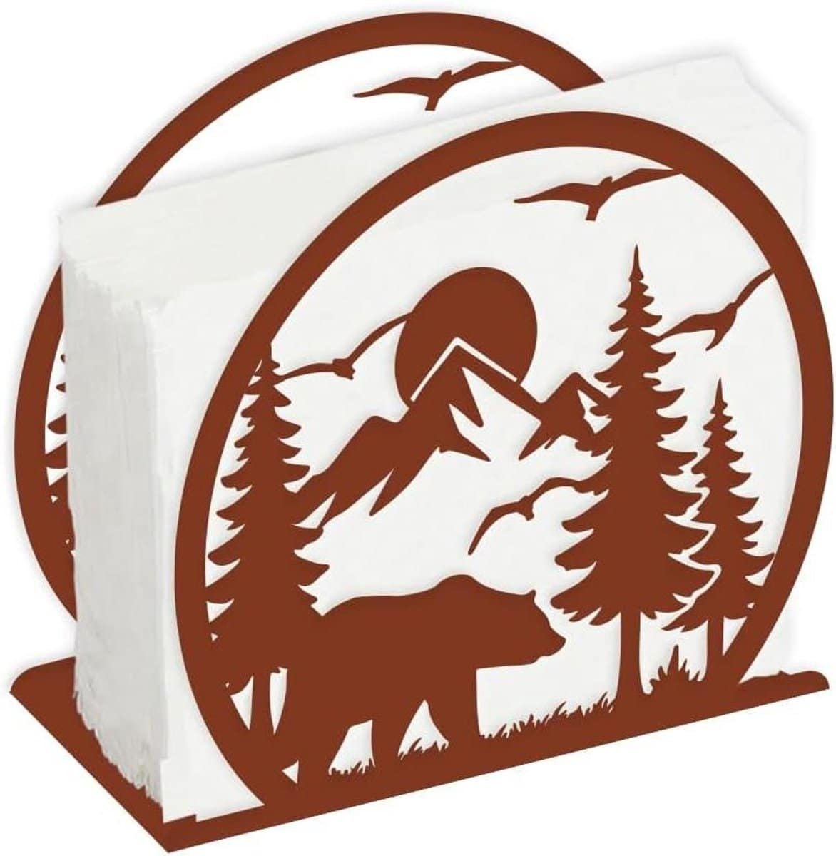 Laat je tafel stralen met deze prachtige servethouder geïnspireerd op de natuur. Met een uniek rond design en een opengewerkt patroon van een beer die door bergachtige bossen wandelt, voegt deze servethouder een vleugje rustieke charme toe aan elke setting.