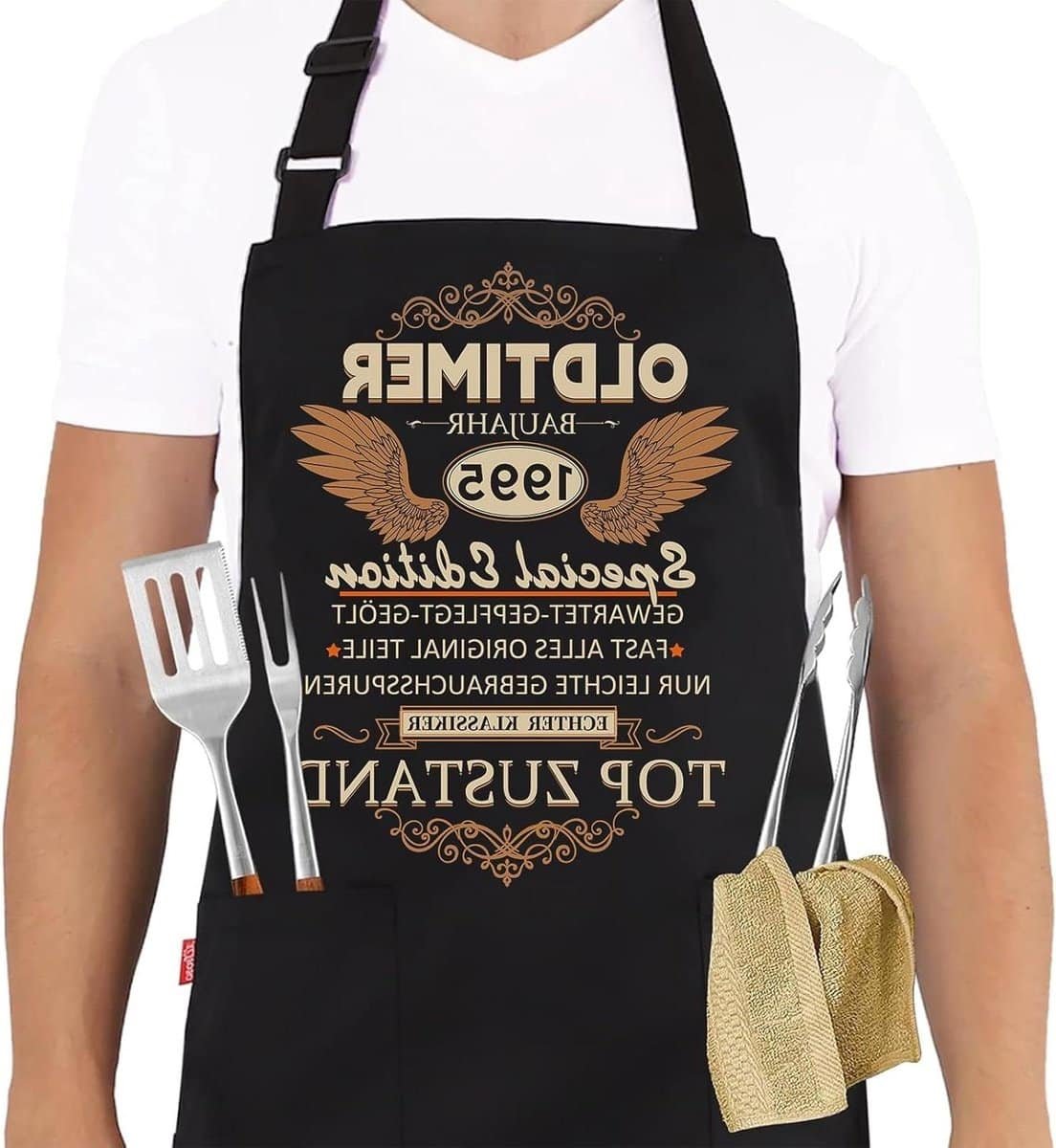 Barbecue schort voor heren - Kookschort 30e verjaardag man - Waterdicht zwart schort met spreuk - Cadeau voor mannen - Geschikt voor keuken - Oldtimer bouwjaar 1995 - Verjaardagscadeau heren - Barbecue accessoire.