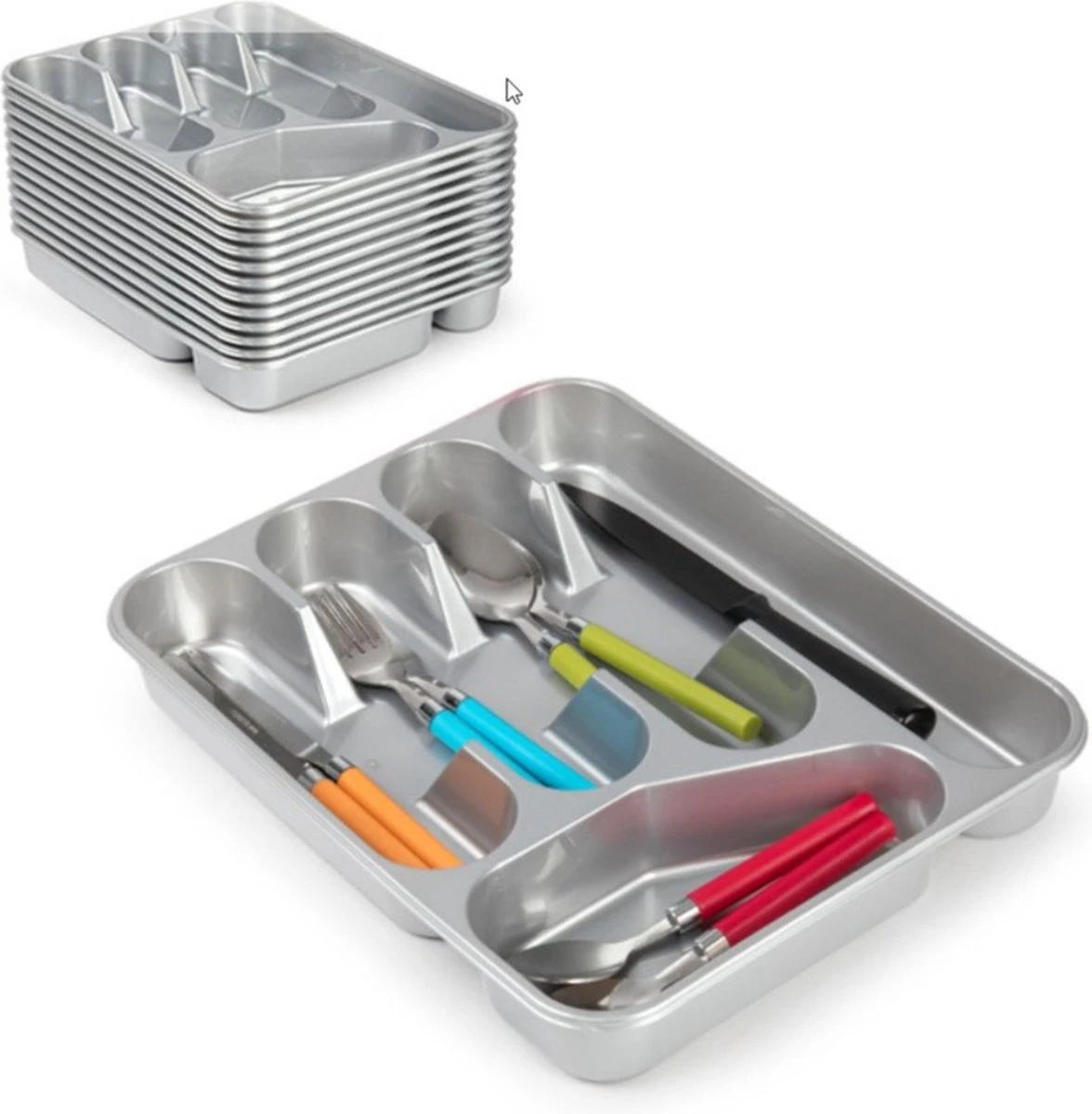 Bestekbak/bestekhouders 5-vaks zilver. Afmetingen: ca. 27 x 33,5 x 4,5 cm. Materiaal: kunststof.
