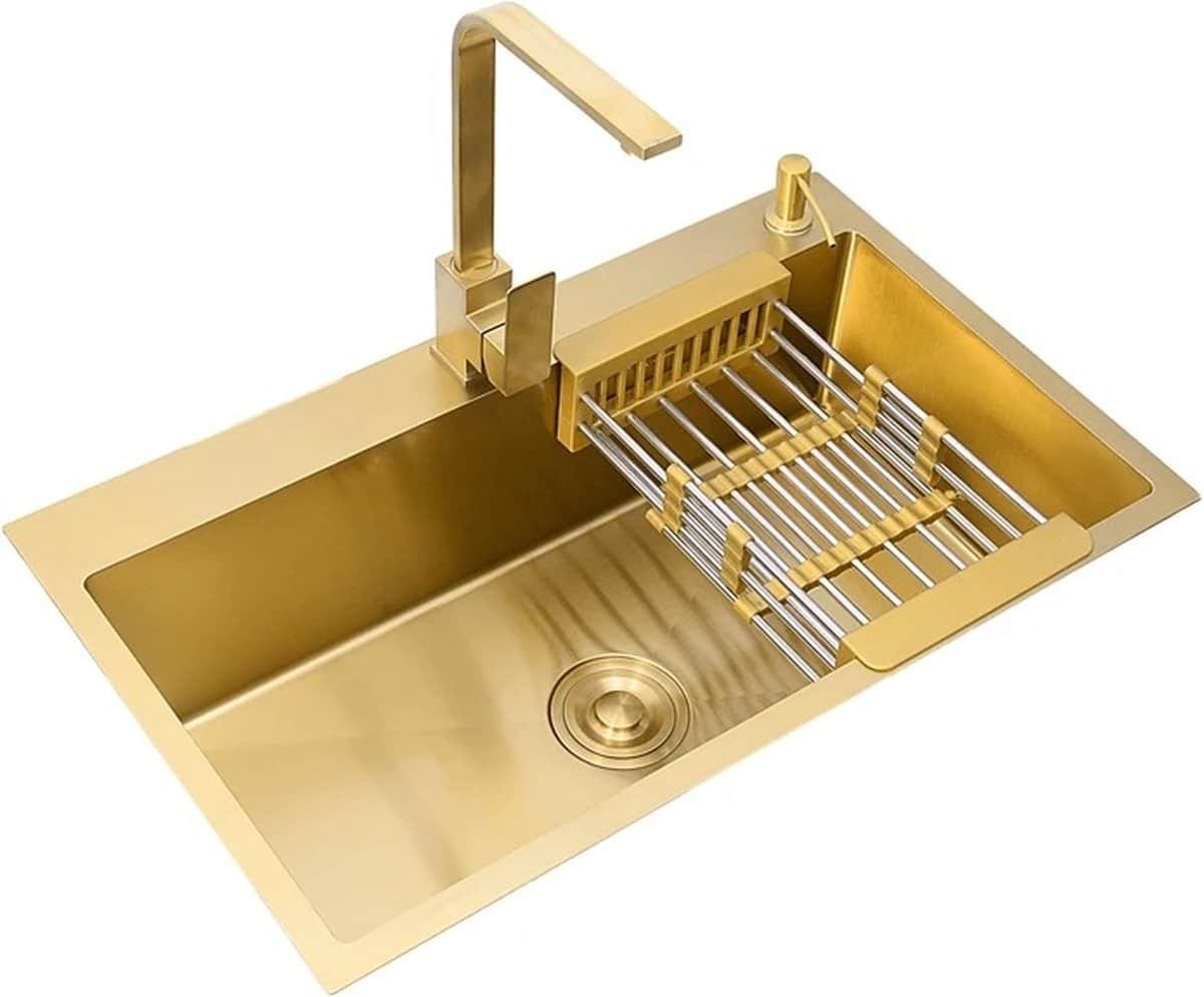 Breng luxe en functionaliteit naar uw keuken of badkamer met deze stijlvolle Gouden Wastafel. Gemaakt van duurzaam 304 roestvrij staal, biedt deze wastafel een perfecte combinatie van elegantie en betrouwbaarheid. Ideaal voor zowel aanrecht- als onderbouwinstallatie, inclusief handige accessoires zoals een gouden mand afdruiprek en een zeepdispenser.