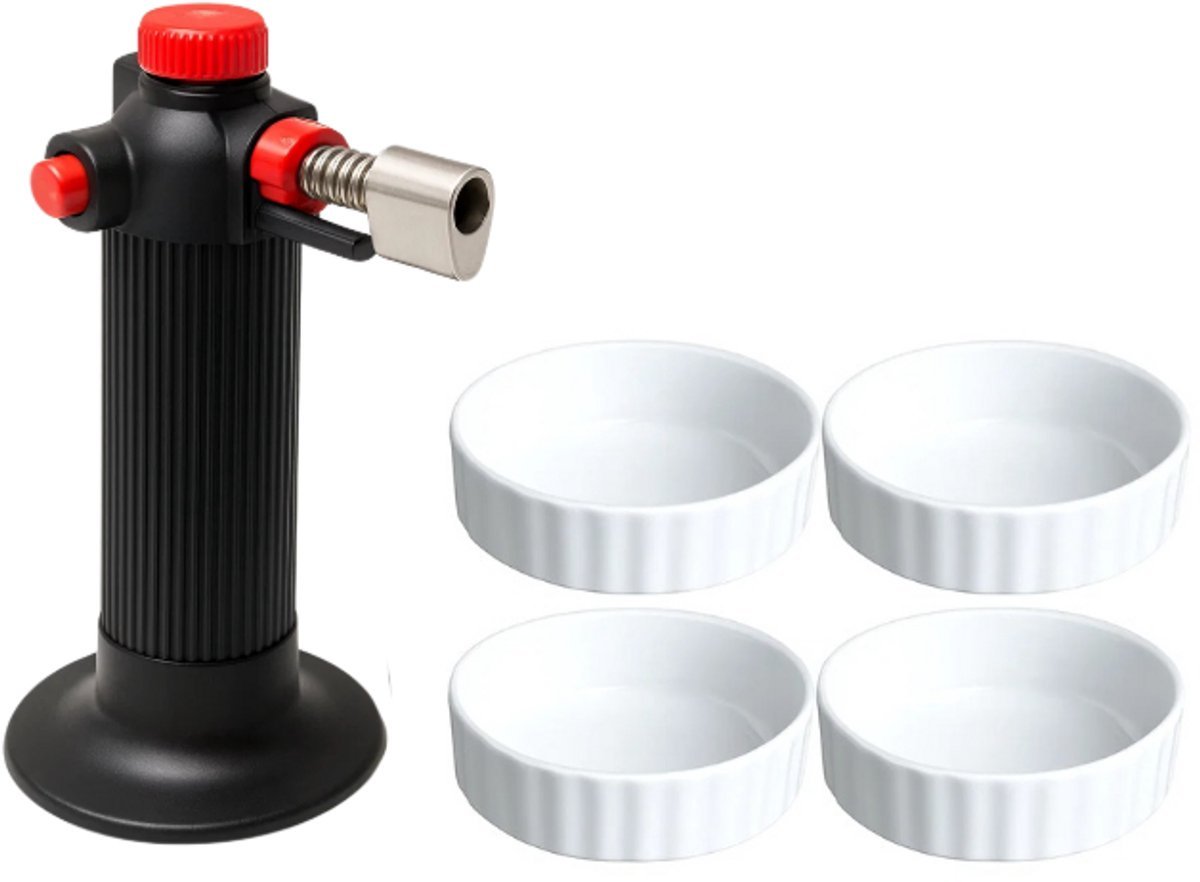 Cookinglife Creme Brulee Set – Brander + 4 Creme Brulee Schaaltjes ø 12 cm – Ideaal voor desserts – Karamelliseren van suiker – Hittebestendig aardewerk – 12 cm – Keukengerei – Keuken accessoires