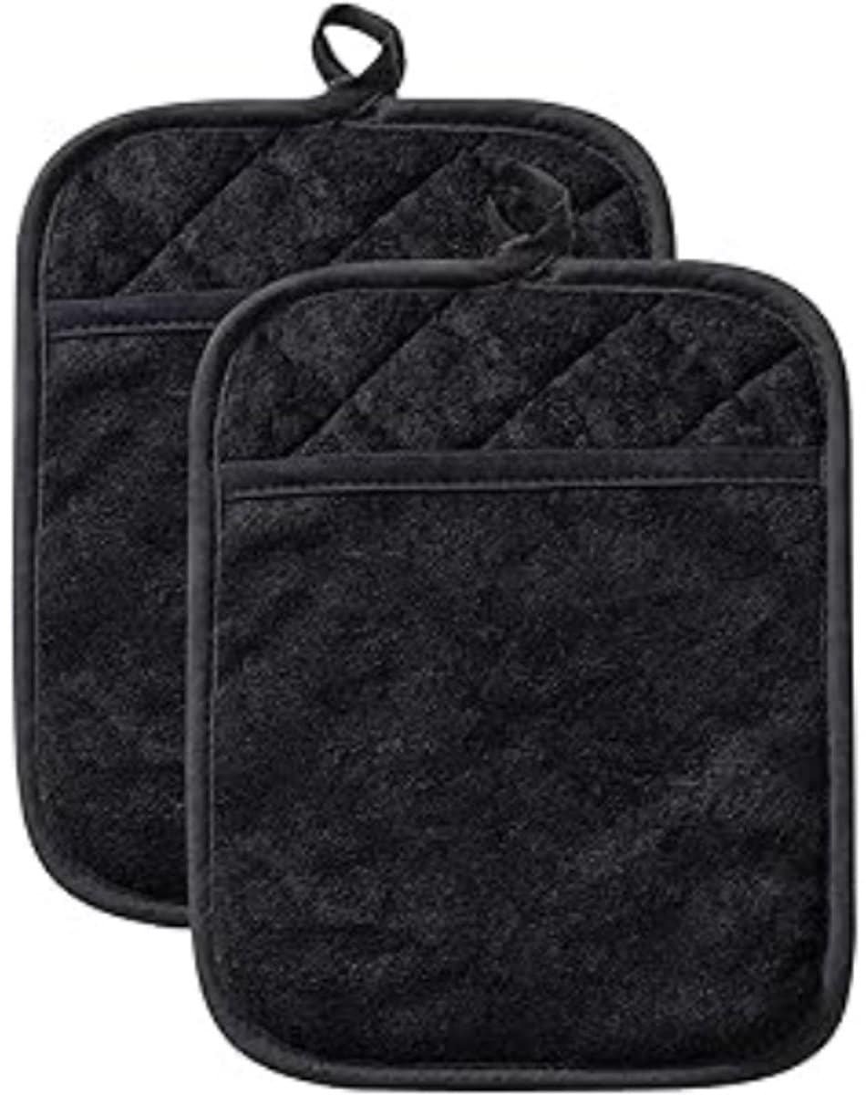Modern en praktisch design: Deze kookartikelen hebben een eenvoudig, elegant zwart design dat naadloos in elke keuken past. De pannenlappen hebben een ophanglus voor eenvoudige opberging in keukenlades. De zakdoeken hebben een eenvoudig, stijlvol design en zijn antislip en hittebestendig. Het flexibele materiaal zorgt voor een stevige grip en veiliger koken.