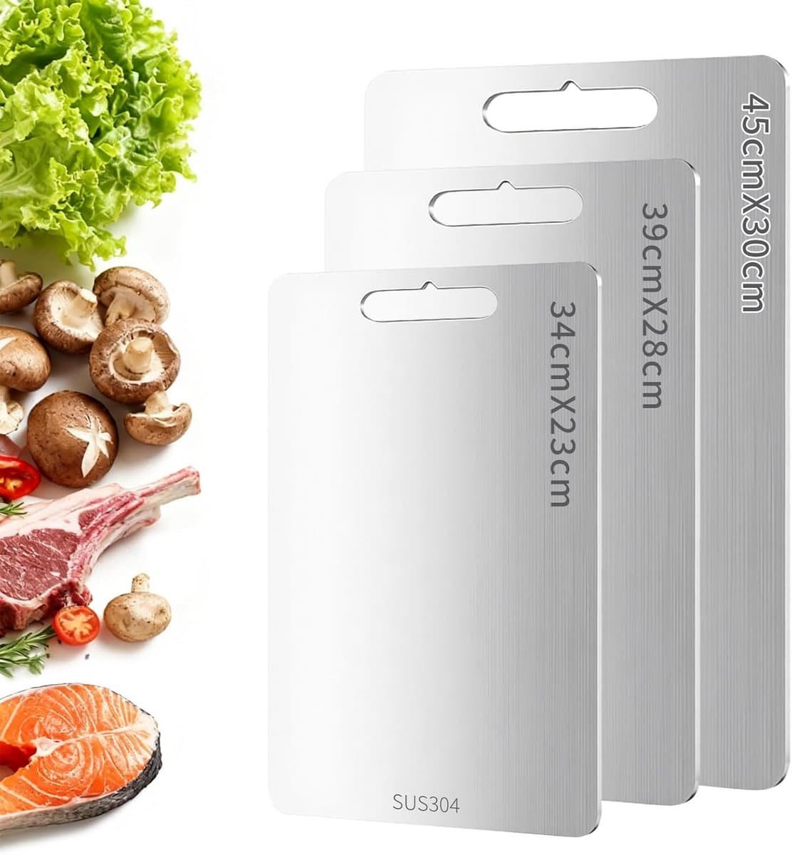 Upgrade uw keuken met deze professionele roestvrijstalen snijplank. Deze dubbelzijdige snijmat, geschikt voor zowel de hobbykok als de professional, combineert duurzaamheid met een moderne uitstraling. De snijplank is vervaardigd uit hygiënisch RVS 304 van 1,2 mm dik, waardoor deze zeer sterk is, bestand tegen meskrassen en geen sappen of geuren absorbeert, in tegenstelling tot traditioneel plastic of bamboe. Belangrijkste kenmerken en voordelen: * **Duurzaam Materiaal:** Gemaakt van dik, voedselveilig RVS 304 dat corrosie- en vlekbestendig is voor langdurig gebruik. * **Dubbelzijdig Gebruik:** Biedt veelzijdigheid; ideaal voor het hakken van groenten, snijden van vlees, kneden van deeg, of als serveerplank voor kaas. * **Makkelijk Onderhoud:** Volledig vaatwasmachinebestendig voor een snelle en eenvoudige reiniging. Droomt snel om watervlekken te minimaliseren. * **Slim Ontwerp:** Lichtgewicht maar stevig, met afgeronde hoeken voor veiligheid en een handig ophanggat voor efficiënte opslag, waardoor uw werkblad vrij blijft. Deze plank (groot formaat: 45 x 30 cm) is perfect afgestemd op al uw culinaire taken en vereenvoudigt uw voorbereidingsroutine aanzienlijk. Verkrijgbaar in verschillende formaten om aan al uw snijbehoeften te voldoen.