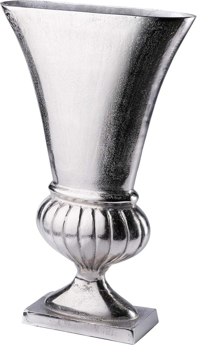 Voeg een vleugje luxe en elegantie toe aan je interieur met deze prachtige, handgemaakte aluminium vaas in zilverkleur. Deze decoratieve vaas heeft een unieke ‘RAW’-look door het ongepolijste oppervlak, wat zorgt voor een individueel textuurpatroon. Verkrijgbaar in verschillende hoogtes (39 cm, 50 cm of 58,5 cm), is deze metalen vaas perfect voor een smalle vensterbank of plank. Het tijdloze zilver integreert moeiteloos in elke woonstijl, van modern tot klassiek. Ideaal als opvallend accent, gevuld met kunstbloemen of decoratief op zichzelf. Dankzij het zware materiaal staat de vaas zeer stabiel. Deze hoogwaardige, met de hand gegoten vaas is een gegarandeerde blikvanger in je entree, woonkamer of kantoor. Let op: Bij gebruik van echte bloemen wordt aangeraden een inzetstuk te gebruiken.