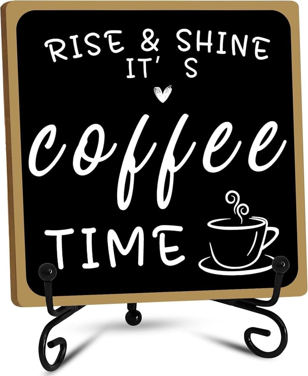 Elegant zwart-wit design: De klassieke zwart-witte kleurencombinatie met de opdruk “RISE, SHINE IT’S COFFEE TIME” in cursief lettertype en een charmante koffiepictogram zorgen voor een moderne en uitnodigende uitstraling.