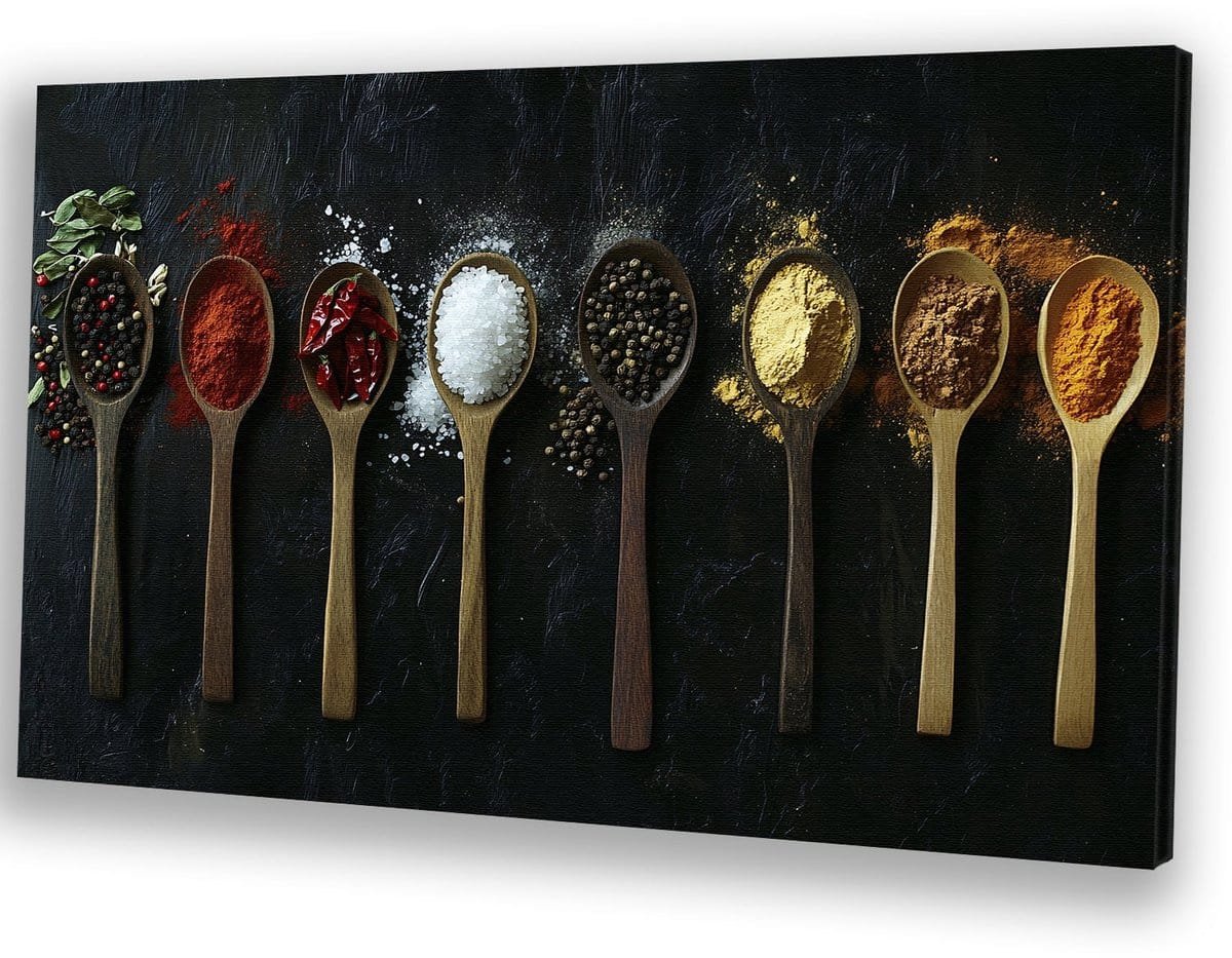 Houten lepels met specerijen – Kruiden – Eten – Stilleven – Muurdecoratie modern – Decoratie keuken – Eetkamer accessoires – Canvas 120×80 cm