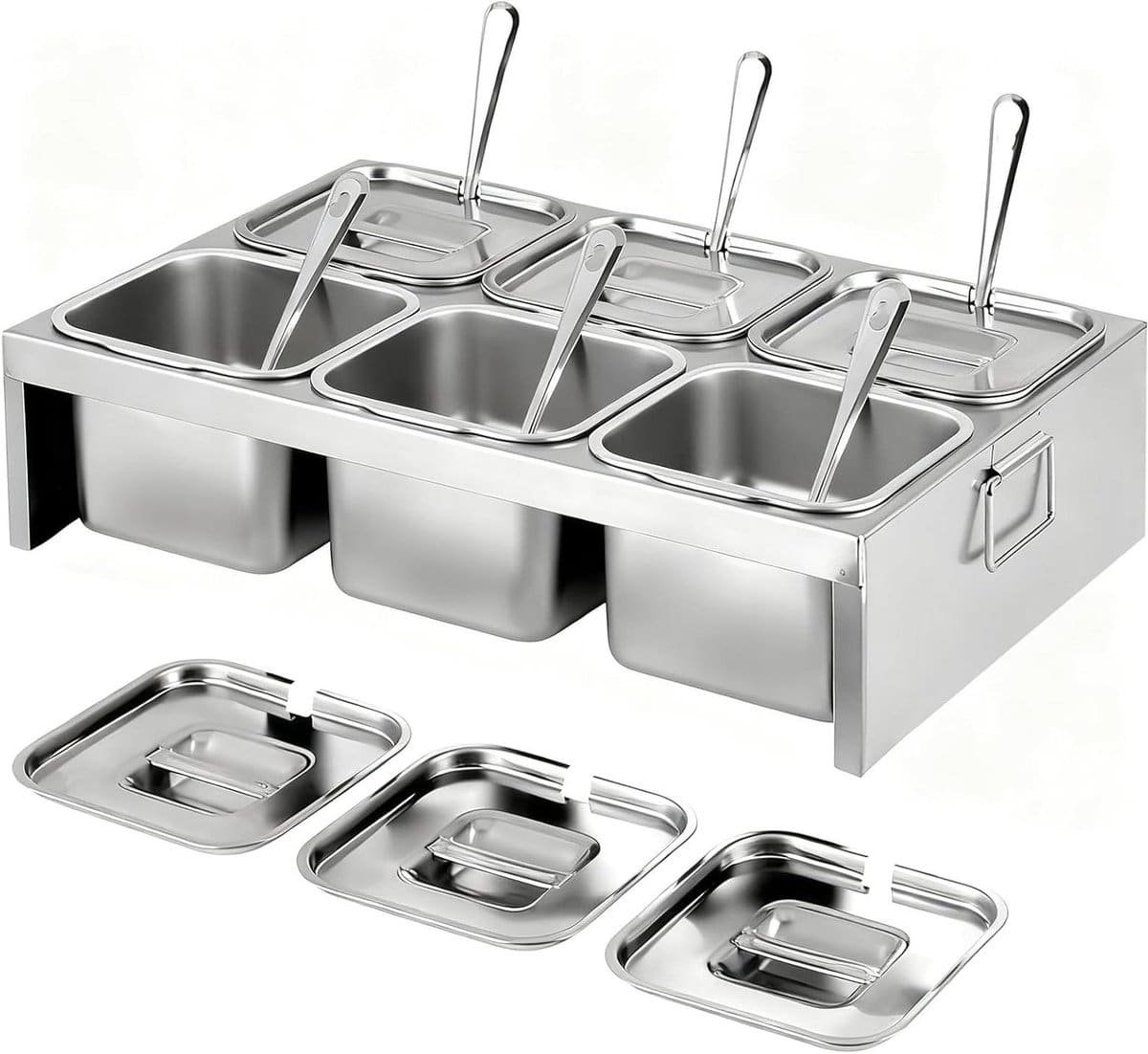 Ingrediëntenbakken set met 6 RVS bakken, deksels en lepels – 6-vaks tray voor pizzatoppings – keuken en horeca accessoire.