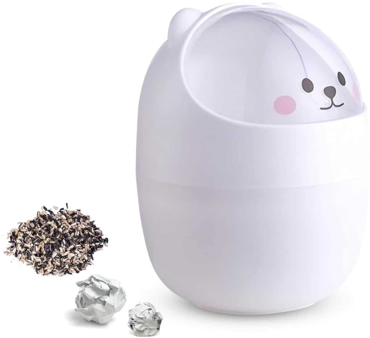 JGS Premium – Mini Desktop prullenbak – Cartoon Kat vorm – Swing deksel – Keuken prullenbak – Klein formaat – Wit – Schattig design – Huisdier thema – Opbergen – Thuis en keuken accessoire.