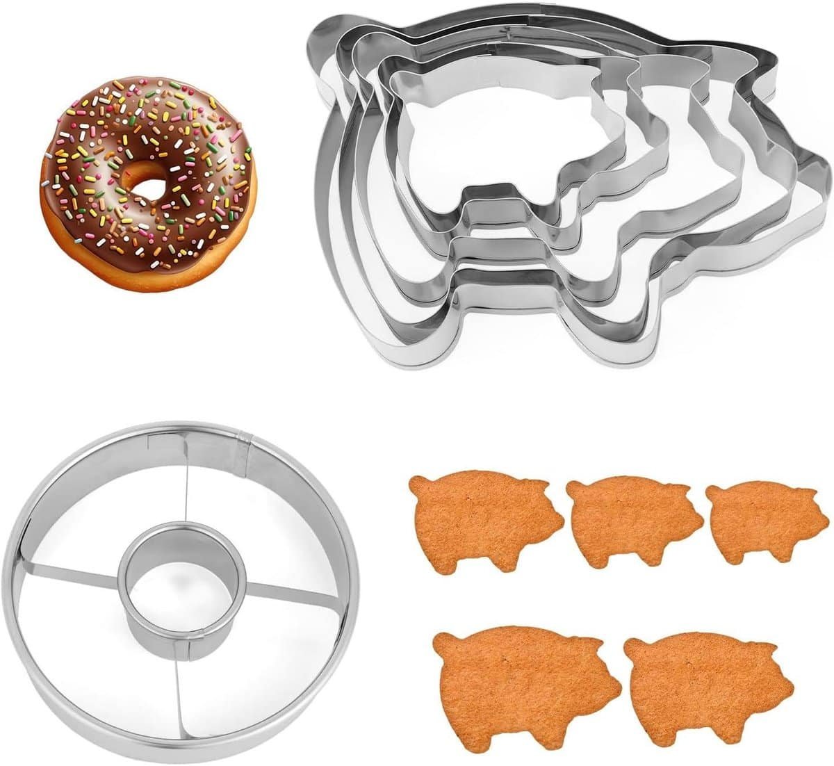 Specificaties: Inhoud van de verpakking: 5 koekvormpjes in varkenvorm in verschillende maten, 1 donutsnijder