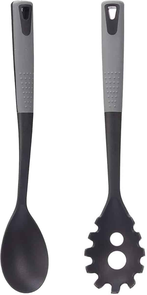 Set van 2 kook/keuken gerei. Deze set bestaat uit 1 opscheplepel 34 cm en 1 pasta lepel van 34 cm. De lepels zijn gemaakt van zwart kunststof met een grijs stevig handvat. De lepels hebben een ophangoog zodat je ze makkelijk kunt ophangen in je keuken. De lepels zijn geschikt voor de vaatwasser. Keukengerei/keuken accessoires. Kookgerei/kook accessoires.