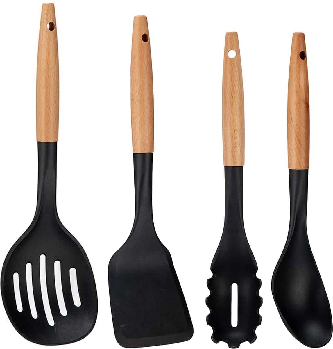 Set van 4 kook/keukengerei. Deze mooie complete set bestaat uit 1 opscheplepel van 33 cm, 1 bakspatel van 34 cm, 1 schuimspaan van 35 cm en 1 spaghetti opscheplepel van 33 cm. Deze set is gemaakt van zwart kunststof met een mooi houten handvat. De keukenaccessoires hebben een ophang lus zodat je ze eenvoudig kunt ophangen. Kleur: zwart/bruin. Materiaal: kunststof en hout. De set is vaatwasmachine bestendig. Keukengerei/keuken accessoires. Kookgerei/kook accessoires.