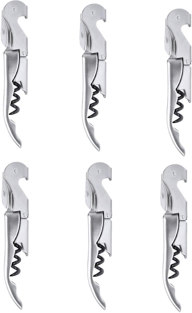 6x een zilveren kurkentrekker, met flessenopener en mesje. Kelnermessen. Materiaal: RVS. Afmeting: 12,2 x 2,2 x 1,2 cm. Gewicht: 55 gr. Wijnflesopener/bieropener. Uitzet cadeau keukenaccessoires openers.
