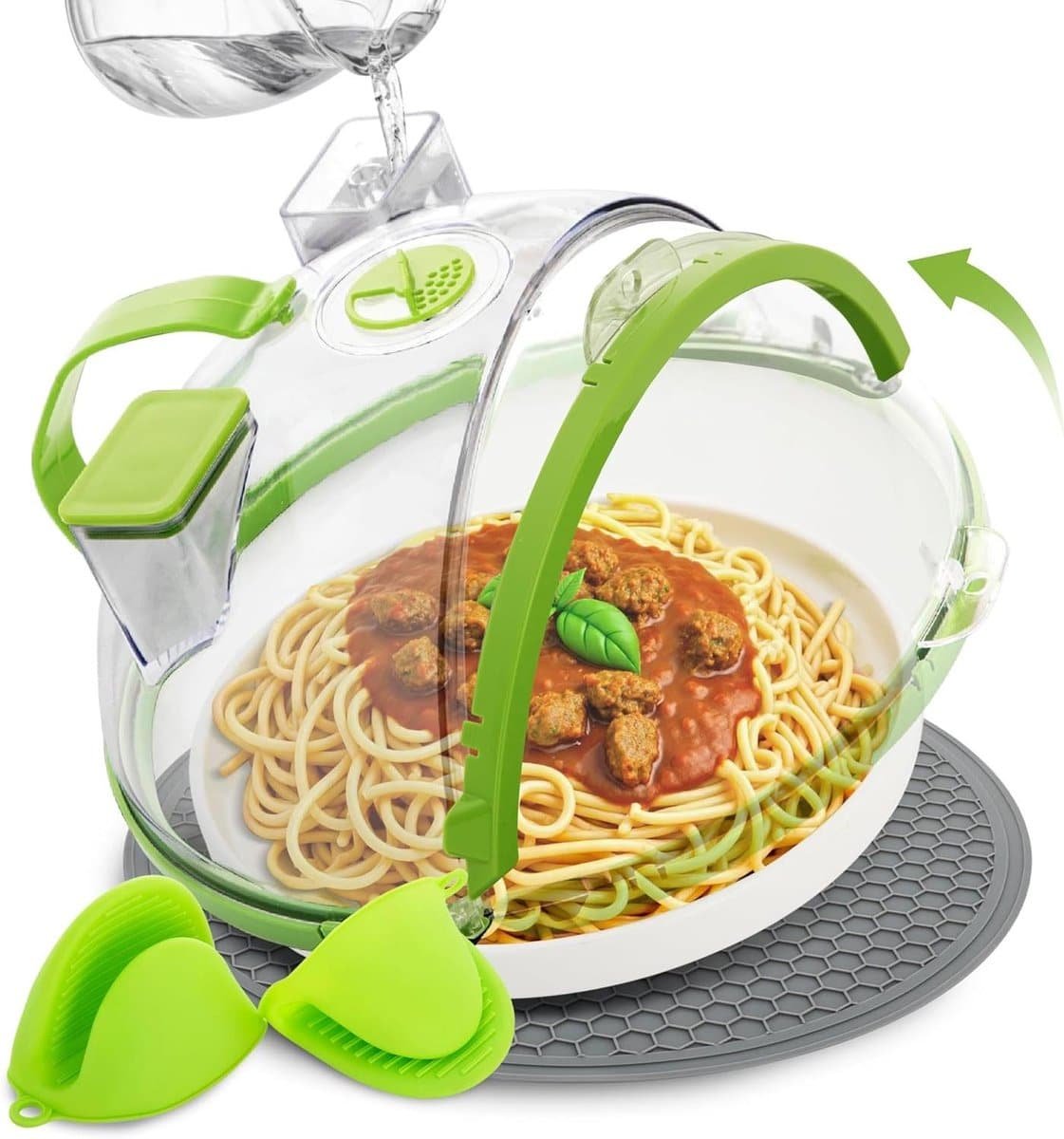 Houd uw magnetron vlekkeloos en uw gerechten heerlijk vochtig met deze complete set. Bent u het schoonmaken van aangekoekte etensresten in uw magnetron beu? Deze set biedt de perfecte oplossing om spatten te voorkomen en tegelijkertijd de kwaliteit van uw opgewarmde maaltijden te behouden, wat resulteert in minder poetswerk en smakelijker eten. Deze veelzijdige set is ontworpen om het opwarmen van voedsel in de magnetron een stuk aangenamer te maken. Het deksel voorkomt effectief dat sauzen en andere etensresten de binnenkant van uw magnetron vies maken. Daarnaast helpt het ingebouwde vochtretentiesysteem, met een speciale waterbak, om uw gerechten sappig en vers te houden, ideaal voor het opwarmen van restjes of het stomen van groenten. De meegeleverde siliconen mat en hittebestendige ovenwanten bieden extra veiligheid en bescherming bij het hanteren van hete schalen en kommen, zowel in de magnetron als daarbuiten. Een van de meest praktische kenmerken van dit deksel is het slimme, opvouwbare ontwerp, waardoor het na gebruik compact opgeborgen kan worden. Met het handige ophanggat past het gemakkelijk in elke keuken. Gemaakt van voedselveilig, BPA-vrij polycarbonaat en siliconen, garandeert deze set duurzaamheid en veiligheid tijdens gebruik. Maak uw keukenervaring eenvoudiger en schoner door vandaag nog deze essentiële set aan te schaffen.