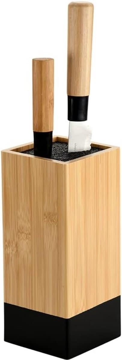 Breng kleur en orde in uw keuken met dit universele messenblok, uitgevoerd in stijlvol bruin bamboe en afgewerkt met een moderne zwarte onderkant. Dit blok is niet alleen een blikvanger door zijn natuurlijke, duurzame uitstraling, het biedt ook een vaste en veilige plek voor al uw messen. Dankzij de geïntegreerde flexibele borstelharen plaatst u eenvoudig messen van diverse vormen en maten in het blok, zodat ze altijd binnen handbereik zijn. Het bamboe is FSC-gecertificeerd, wat bijdraagt aan verantwoord bosbeheer. Afmetingen: 10 x 10 cm, hoogte 23 cm. Reiniging wordt aangeraden met de hand. Een essentieel, kwalitatief huishoudelijk artikel dat koken leuker maakt.