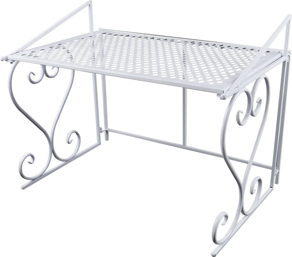 Organiseer je keuken met het smeedijzeren ovenopslagrek. Dit stijlvolle en functionele rek is ontworpen om boven je keukenapparatuur, zoals een magnetron, te plaatsen en biedt extra ruimte voor keukengerei. Met twee niveaus kun je gemakkelijk verschillende items opbergen en je keuken netjes houden. Het rek is eenvoudig op te bouwen en past perfect in elke keukenruimte.