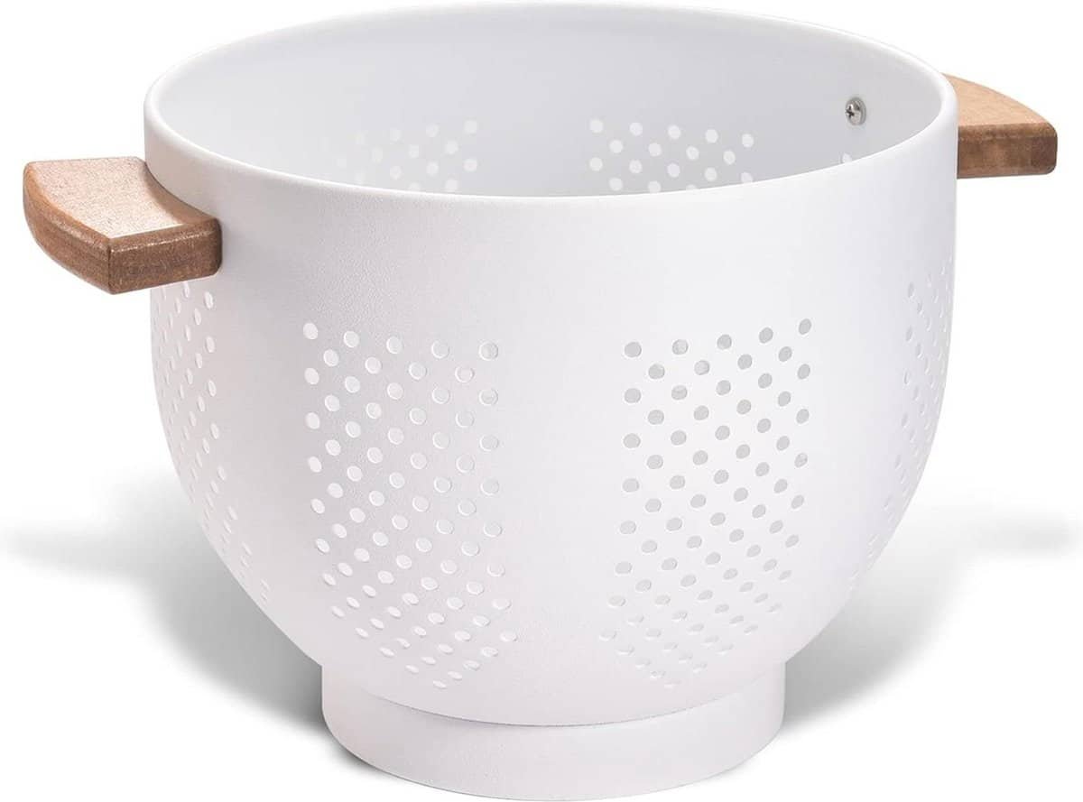Metalen vergiet 22 cm met houten handvat – gepoedercoat keuken accessoire voor pasta, fruit en groenten – mat wit Vergiet