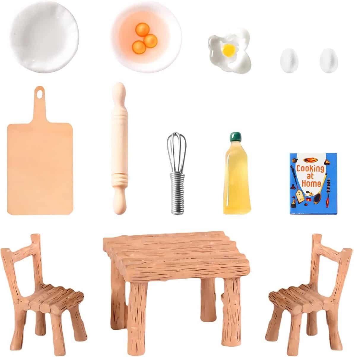 Deze uitgebreide miniatuur bakset bevat 13 stuks poppenhuisaccessoires, perfect voor het decoreren van je poppenhuiskeuken. De set is ideaal voor rollenspellen en detailhandige hobbyisten. Inbegrepen zijn: 1 mini-tafel, 2 mini-stoelen, 1 mini-snijplank, 1 mini-deegroller, 1 miniatuur geel eierdoosje, 1 miniatuur olijfolie, 3 miniatuureieren, 1 mini-garde, 1 miniatuur eierschaal en 1 miniatuur kookboek. Voeg een realistische en charmante touch toe aan de speelwereld van je poppenhuis.