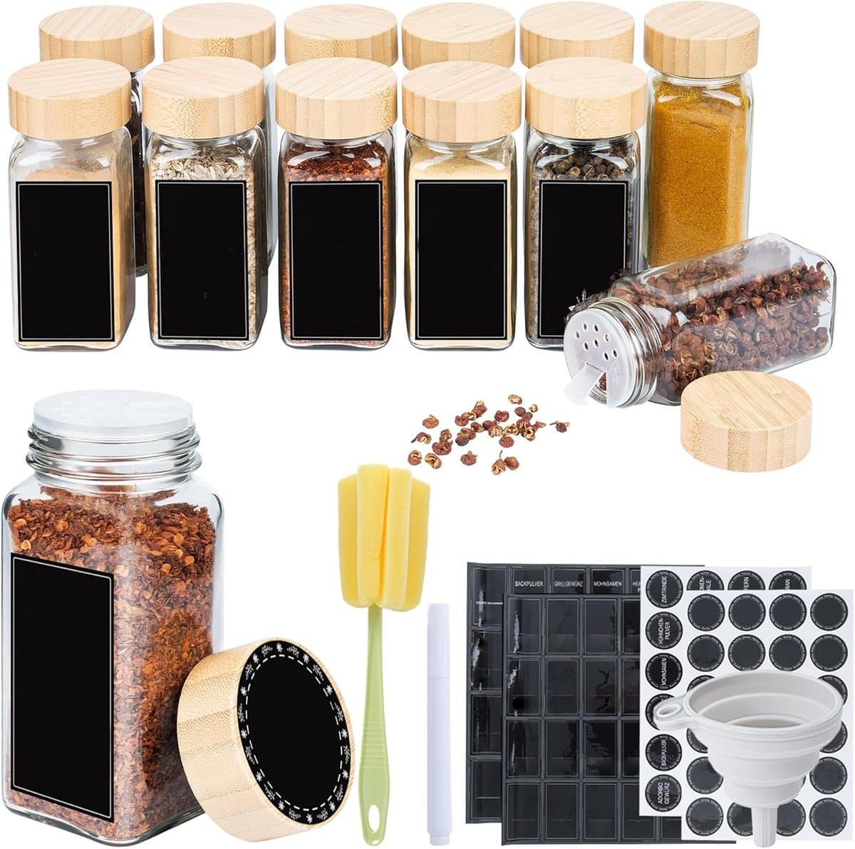 NAIZY kruidenpotjes vierkant 12 stuks 120ml glazen kruidenpotjes met hagelslag inzet, waterdichte etiketten, trechter, schoonmaakborstel kruidenpotje voor kruiden keuken accessoires, houten deksel