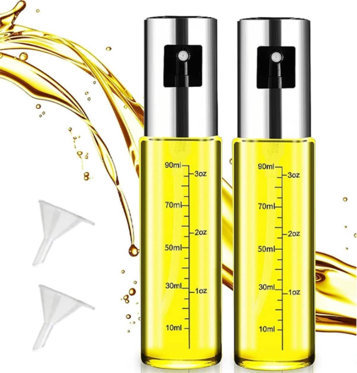 Olie- en azijnsproeier: Giet gewoon de olie in het reservoir en druk op de sproeier, de meegeleverde 2 mini-trechters kunnen gemakkelijk worden gevuld.