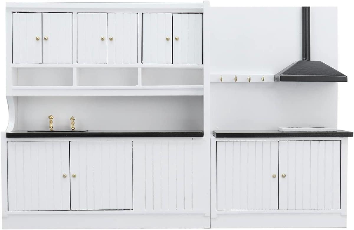 Realistische en schattige miniatuur keuken set voor poppenhuizen in schaal 1:12. Deze set bevat een subtiel zwart-wit ontwerp, wat zorgt voor een sfeervolle en eenvoudige uitstraling. De houten poppenhuis meubels zijn ontworpen voor 1:12 poppen en poppenhuizen, wat een romantische en realistische speelsituatie creëert. Door het compacte formaat is de set gemakkelijk te hanteren. Deze keukenaccessoires zijn ideaal om de poppenhuis keuken, eetkamer of woonkamer te versieren en stimuleren de creativiteit en rollenspel bij kinderen. Het is een perfect cadeau voor meisjes voor verjaardagen of kerst. Afmetingen meubelpaneel: ongeveer 16,5 cm breed x 4,7 cm diep x 18,5 cm hoog. Afmetingen afzuigkap: ongeveer 11 cm breed x 4,7 cm diep x 18,5 cm hoog. De set bevat een meubelpaneel en een afzuigkap.